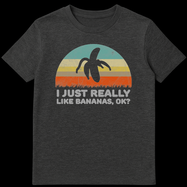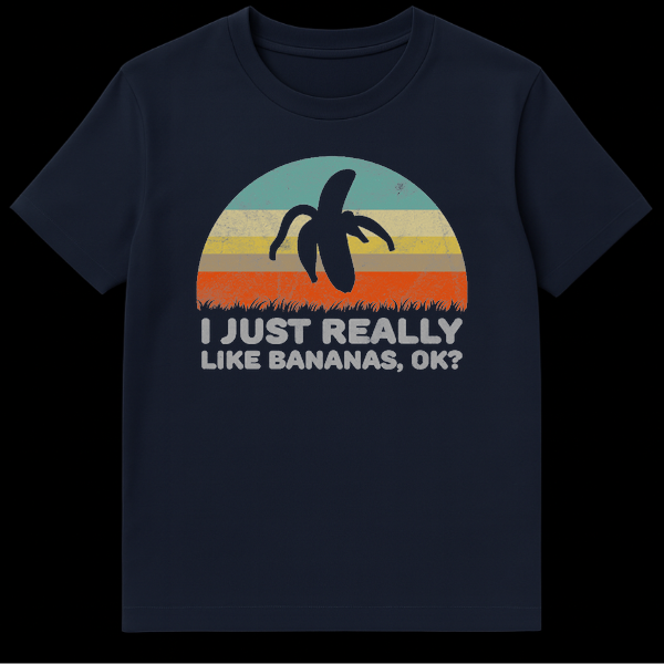 Unleash your inner banana aficionado with this incredibly charming and humorous t-shirt design. The bold statement, “I JUST REALLY LIKE BANANAS, OK?” resonates deeply with anyone who shares an unreserved passion for this beloved fruit, making it a relatable and amusing conversation starter. The design features a cool, distressed black silhouette of a partially peeled banana, set against an eye-catching semi-circular backdrop of vintage-style horizontal stripes in teal, yellow, brown, and orange. This retro aesthetic, combined with the subtle grunge texture, gives the shirt a unique and nostalgic vibe.