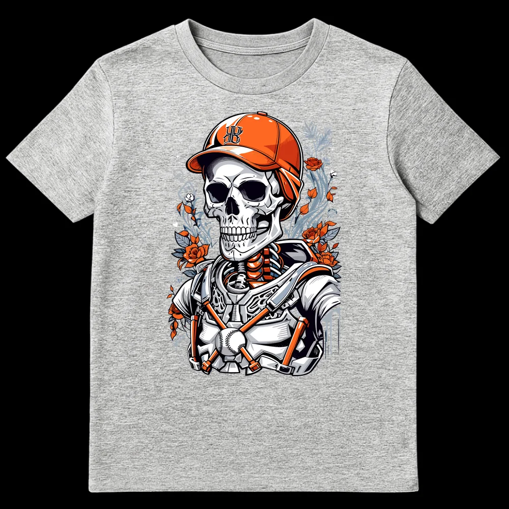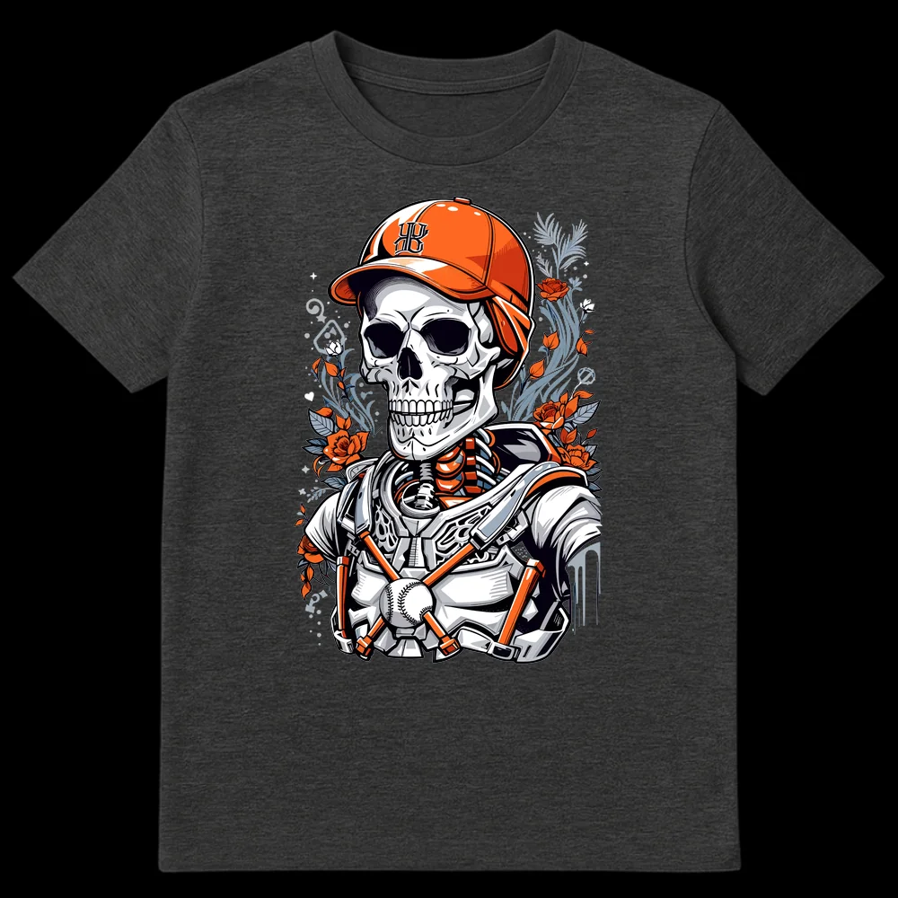 Unleash your inner hardcore baseball enthusiast with this striking t-shirt, celebrating an undying love for the game. This design features a detailed skeleton catcher, complete with a baseball cap adorned with a classic “HB” monogram and full protective gear, ready for eternal innings. Surrounded by vibrant orange roses and subtle foliage, it’s a powerful visual metaphor for playing ’til death. This blend of baseball devotion and neo-traditional tattoo art creates a unique, edgy aesthetic that stands out. It’s an ideal gift for baseball fans, especially those who appreciate unique art, tattoo culture, or simply have an unbreakable bond with their favorite sport or team. Embrace the spirit of ultimate fandom and showcase your distinctive style on game day or any day.