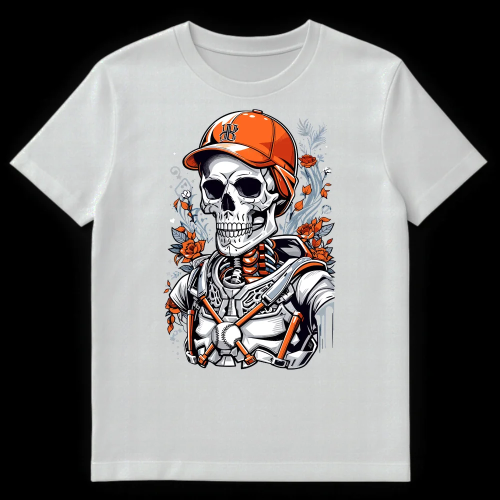 Show your undying passion for America’s favorite pastime with this unique skeleton baseball catcher design. Featuring a skull in full gear, vibrant orange roses, and a classic “HB” monogram, it embodies eternal loyalty to the game. Perfect for any hardcore baseball enthusiast who loves an edgy, artistic twist.