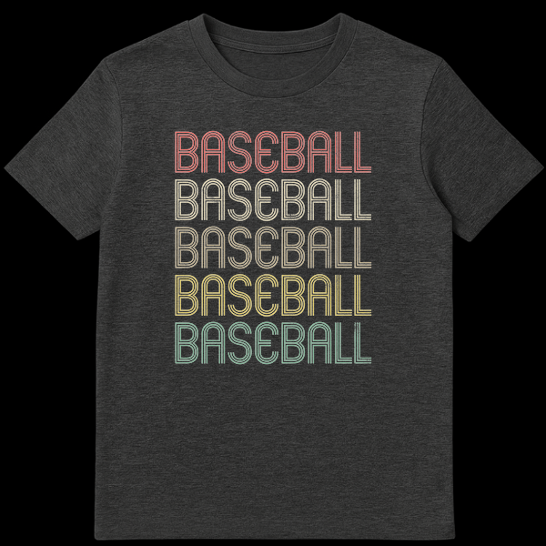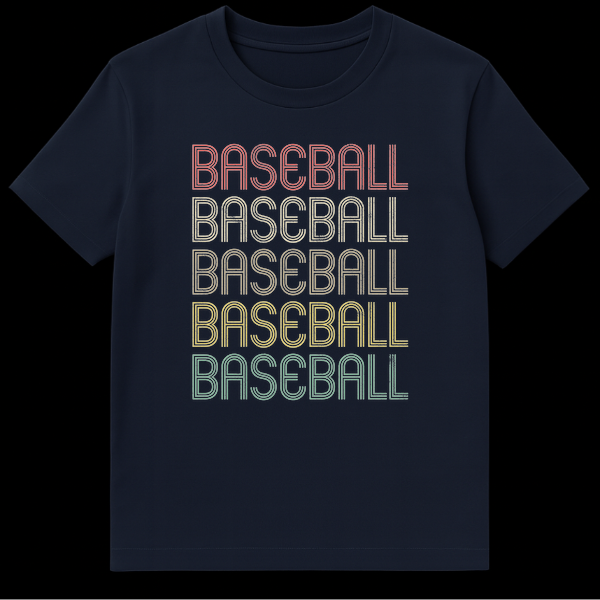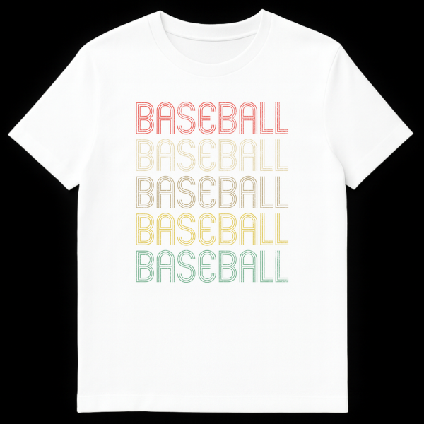 Celebrate America’s favorite pastime with this unique t-shirt featuring the word “BASEBALL” repeated five times. Each instance boasts a different retro-style color—from coral to muted teal—and a distinct grunge texture, all set against a sleek black background. This design perfectly captures a vintage aesthetic for any baseball enthusiast and makes an ideal gift for fans of classic sports apparel.