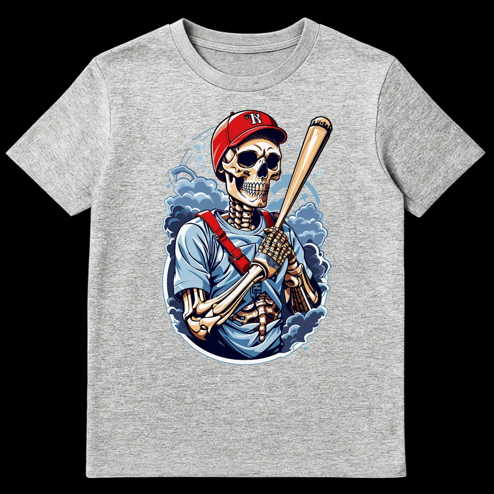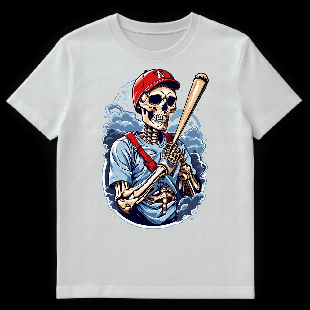 Unleash your undying passion for the game with this unique baseball t-shirt featuring a dynamic skeleton batter. Sporting a classic red cap with a bold ‘R’, this design combines macabre style with serious sports dedication. Perfect for ‘die-hard’ baseball fans, Halloween enthusiasts, or anyone who loves an edgy, artistic twist on sports apparel. It’s an unforgettable gift for the baseball fanatic in your life.