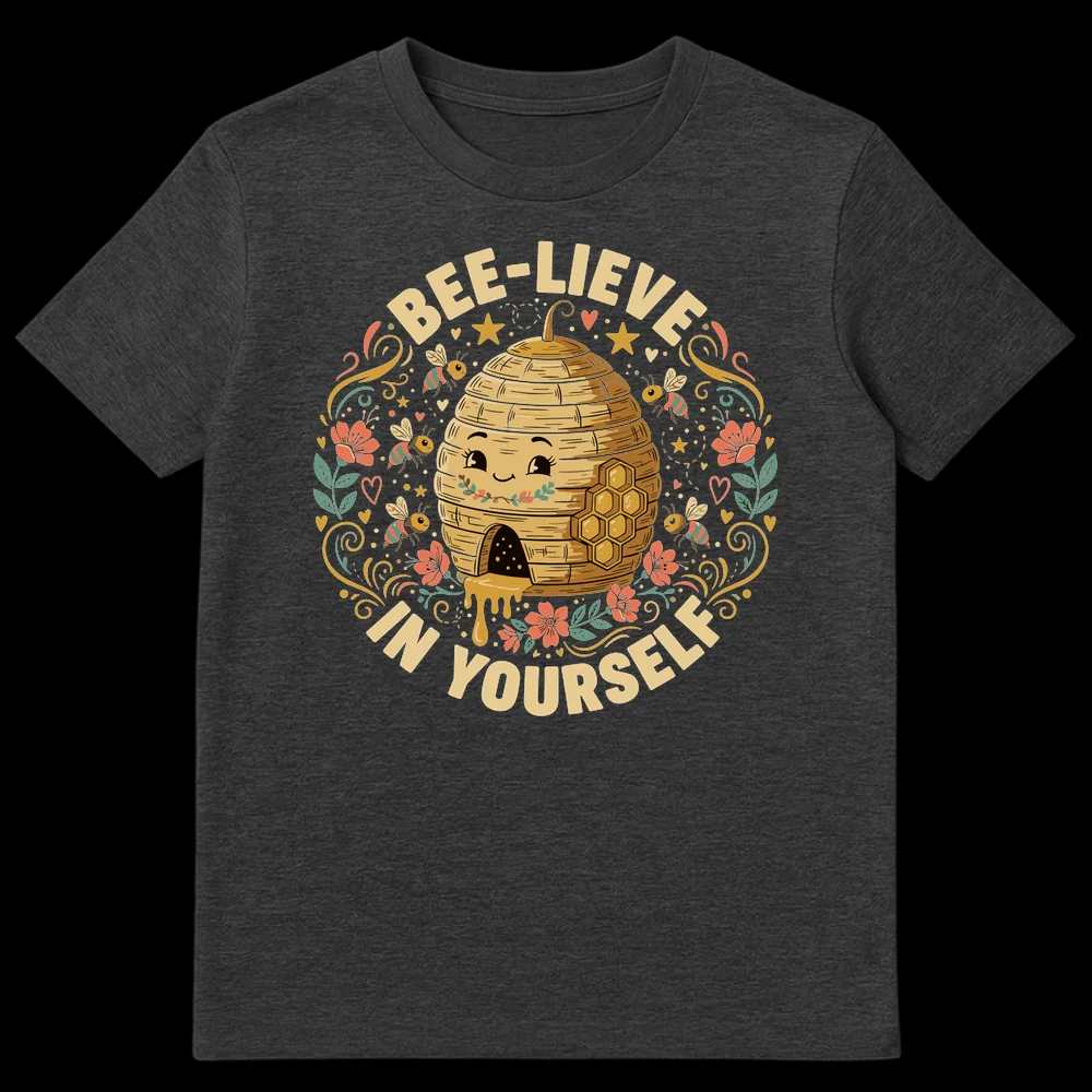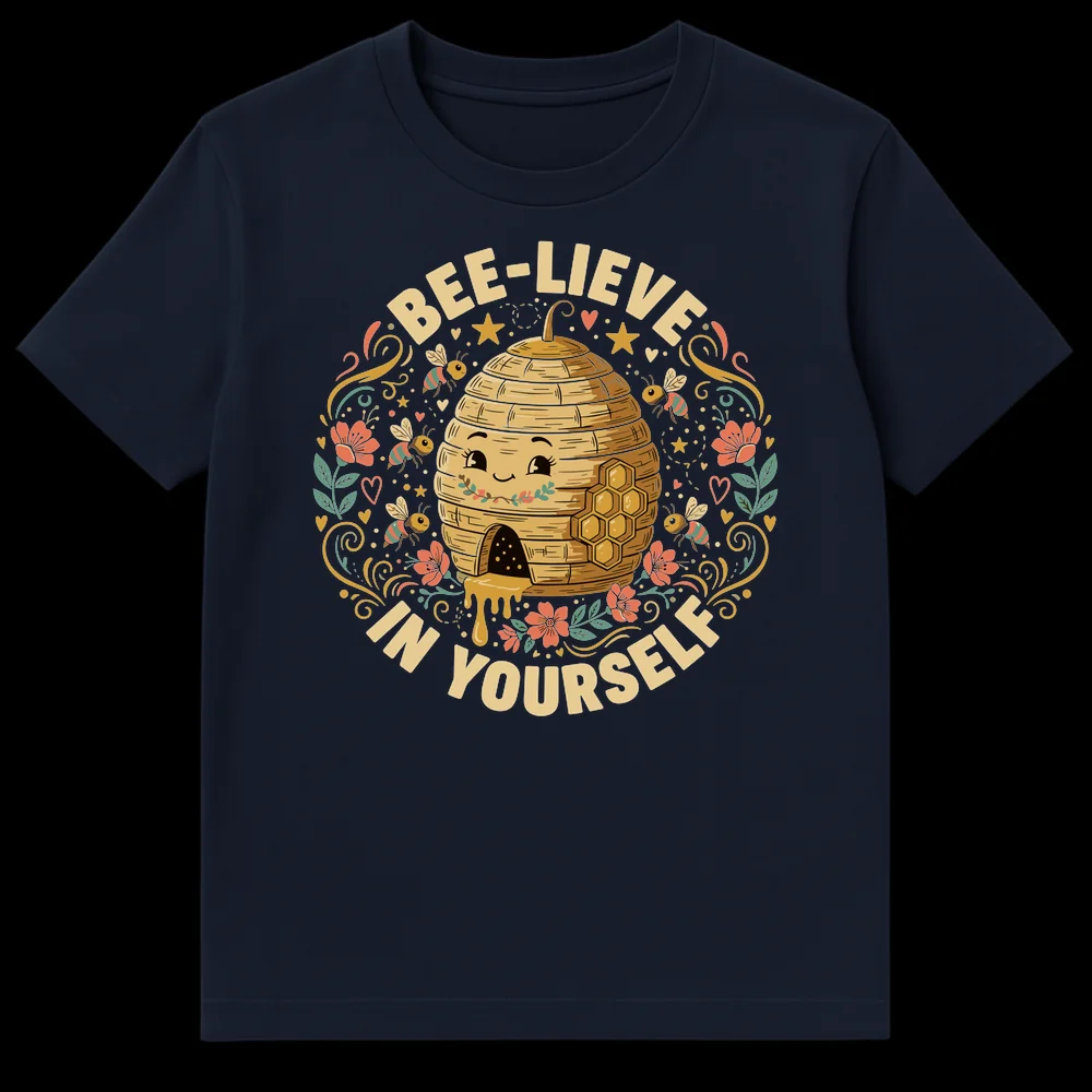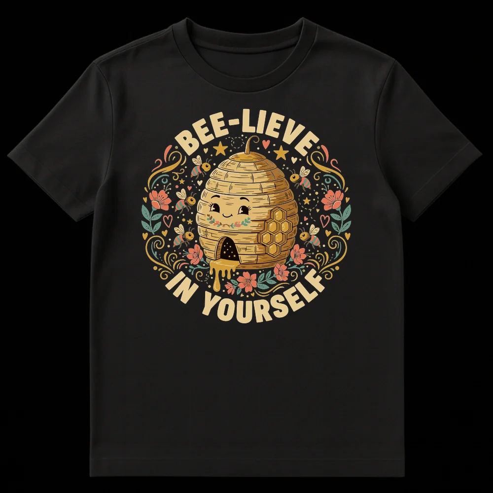 Spread joy and confidence with our ‘BEE-LIEVE IN YOURSELF’ t-shirt, a heartwarming blend of whimsical art and empowering message. This design features a lovable, smiling beehive surrounded by adorable cartoon bees, dripping with golden honey, and adorned with cheerful flowers and stars. The clever ‘BEE-LIEVE’ pun transforms a simple phrase into a powerful, nature-inspired affirmation, making it a truly special and uplifting piece. Crafted with a charming illustrative style and a vibrant, earthy color palette, this tee is more than just clothing; it’s a wearable reminder to trust in yourself. Perfect as an encouraging gift for young adults, teachers, nature lovers, or anyone who appreciates a touch of sweetness and positivity in their daily life.