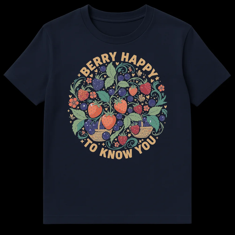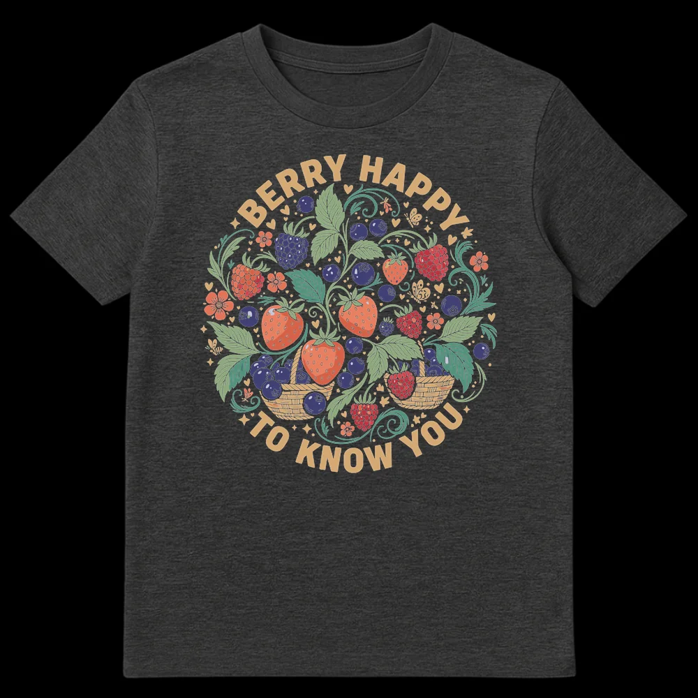 Celebrate friendships with our “BERRY HAPPY TO KNOW YOU” T-Shirt, featuring a delightful, hand-drawn design of various berries and lush foliage. This charming tee playfully substitutes “very happy” with “berry happy,” making it a sweet conversation starter. It’s the perfect gift for nature lovers, gardeners, or anyone who enjoys wholesome humor and fruity aesthetics.