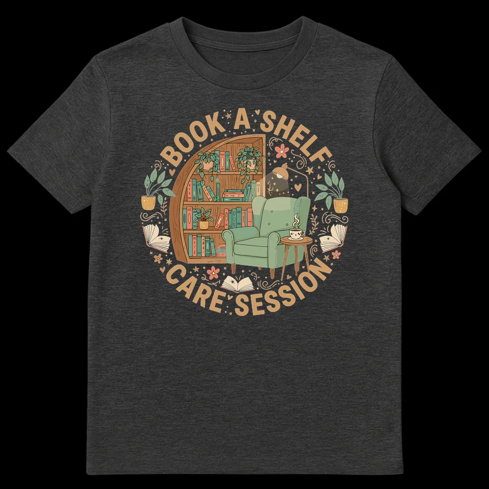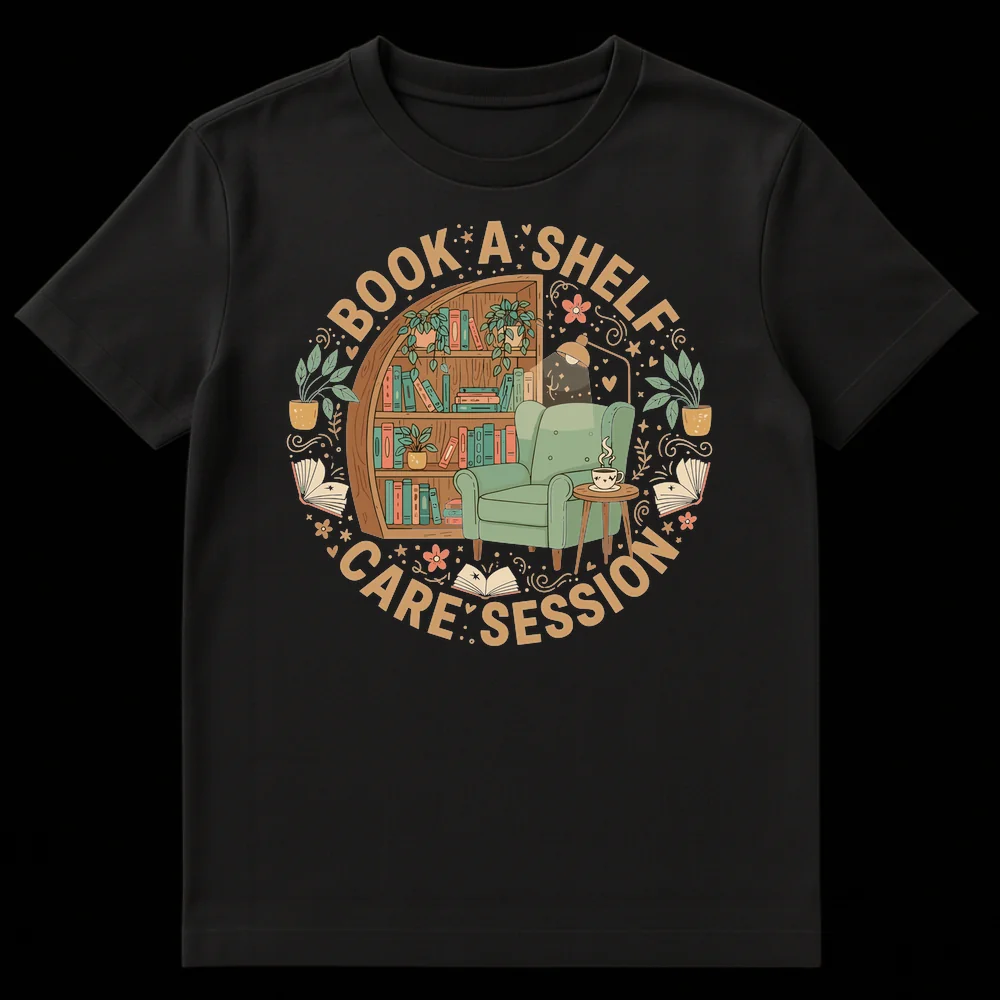 Embrace your inner bookworm with this charming t-shirt featuring a warm reading nook and the clever pun “BOOK A SHELF CARE SESSION.” This design beautifully combines the joy of reading with the importance of self-care. It’s the perfect gift for any bibliophile, librarian, or teacher who cherishes quiet moments with a good book.