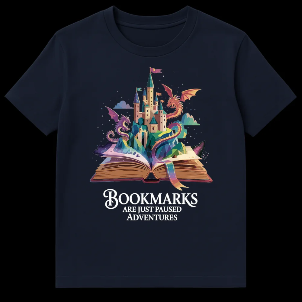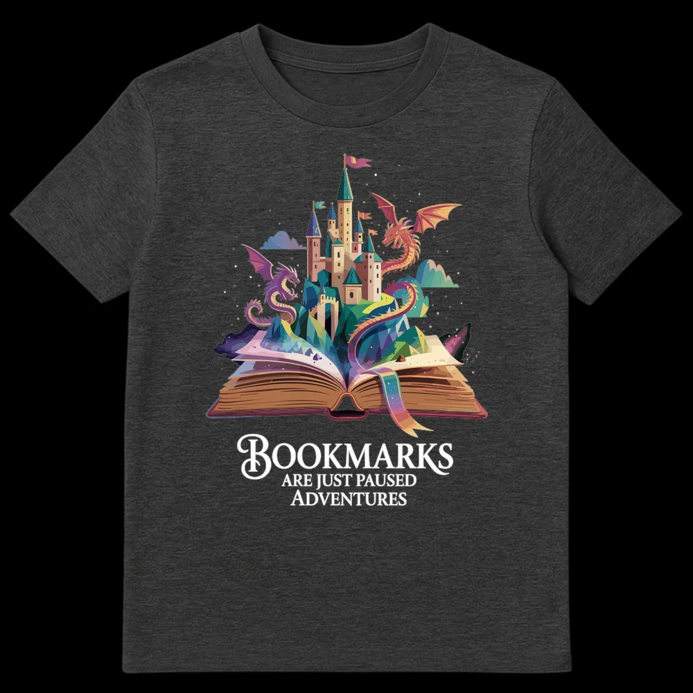 Celebrate the magic of storytelling with our “Bookmarks Are Just Paused Adventures” t-shirt. This enchanting design captures the essence of losing yourself in a book, depicting a rich fantasy landscape of castles, dragons, and mountains bursting forth from an open novel. It beautifully illustrates the deep connection readers have with their stories, where a simple bookmark marks not an end, but a momentary pause in an epic journey. Ideal for book lovers, fantasy enthusiasts, librarians, or teachers, this shirt makes a thoughtful gift, inspiring wonder and appreciation for the worlds books create. Wear your passion for literature and adventure.