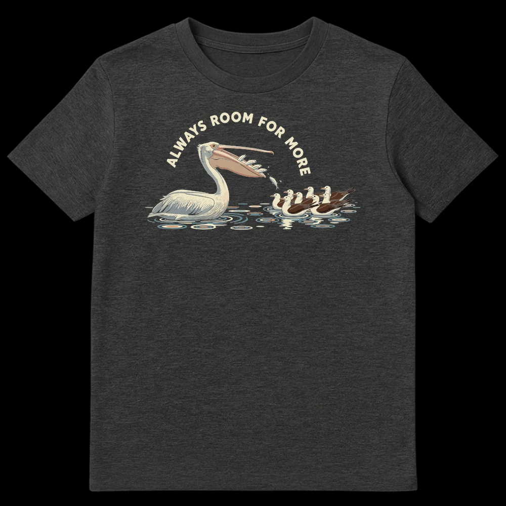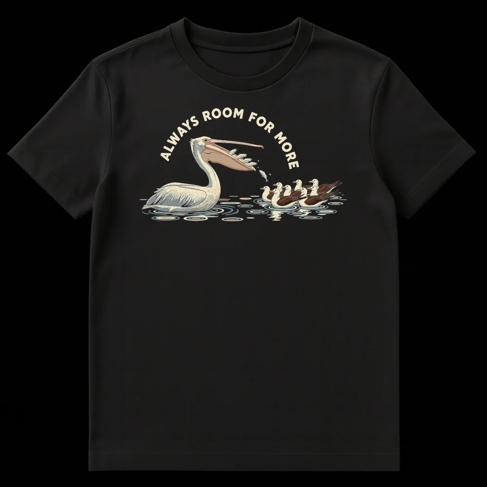 Embrace your love for food and nature with our “Always Room For More” t-shirt. This humorous design features a pelican with an overflowing pouch of fish, perfectly capturing the relatable sentiment of a hearty appetite. It’s a clever visual pun that combines wildlife charm with a universally understood phrase, making it an ideal gift for foodies, bird watchers, or anyone who enjoys a good laugh.