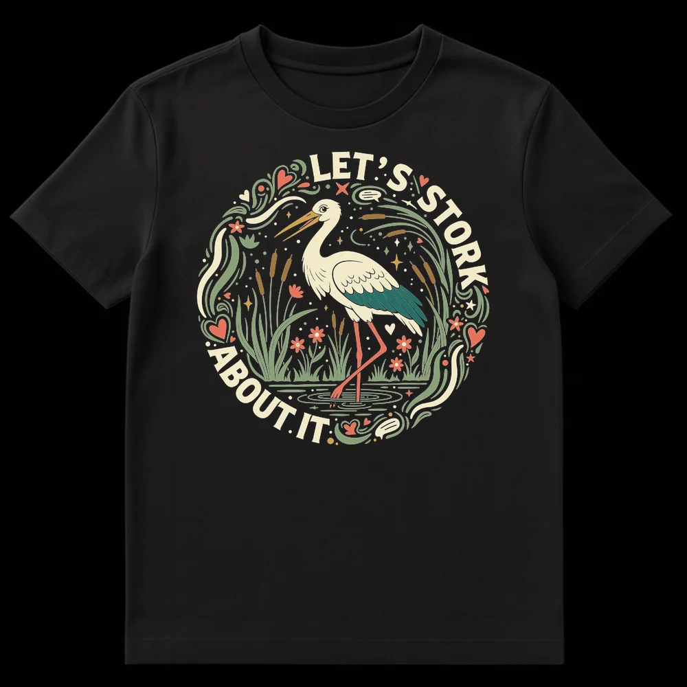 Embrace the tranquility and wit of nature with our unique “LET’S STORK ABOUT IT” t-shirt. This design cleverly blends the majestic stork, a symbol of natural beauty, with a beloved idiom, creating a truly memorable and humorous statement. The illustrative folk art style, featuring a serene stork in a lush marsh surrounded by cattails and flowers, evokes a sense of calm and appreciation for the outdoors. Adorned with a rich, earthy color palette of deep teal, olive green, warm cream, and muted coral against a stark black background, this shirt offers a vintage-inspired aesthetic that is both charming and sophisticated. It’s an ideal choice for birdwatchers, wildlife enthusiasts, or anyone who loves a clever pun and wants to share a smile. This tee makes an exceptional gift for friends or family who appreciate thoughtful humor and beautiful, nature-inspired art.