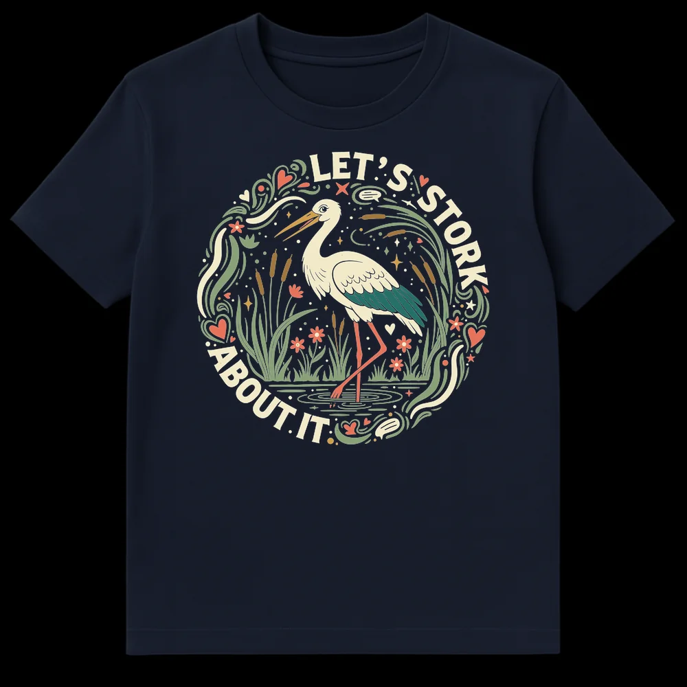 Dive into gentle humor with our “LET’S STORK ABOUT IT” t-shirt, a clever play on words for nature enthusiasts. This design features a whimsical stork amidst marshland flora, rendered in a charming folk art style with an earthy color palette. It’s the perfect lighthearted statement piece or a thoughtful gift for bird lovers and pun appreciators who enjoy wholesome, unique apparel.