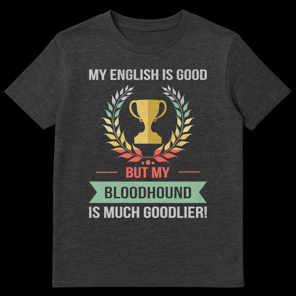 Celebrate your love for Bloodhounds with this witty retro vintage t-shirt featuring a trophy and laurel wreath design. The clever text, “MY ENGLISH IS GOOD BUT MY BLOODHOUND IS MUCH GOODLIER!”, pokes fun at grammar while declaring supreme affection for your furry friend. It’s the perfect gift for Bloodhound owners who appreciate a good laugh and proudly show off their pet parent humor.