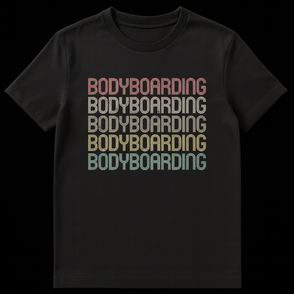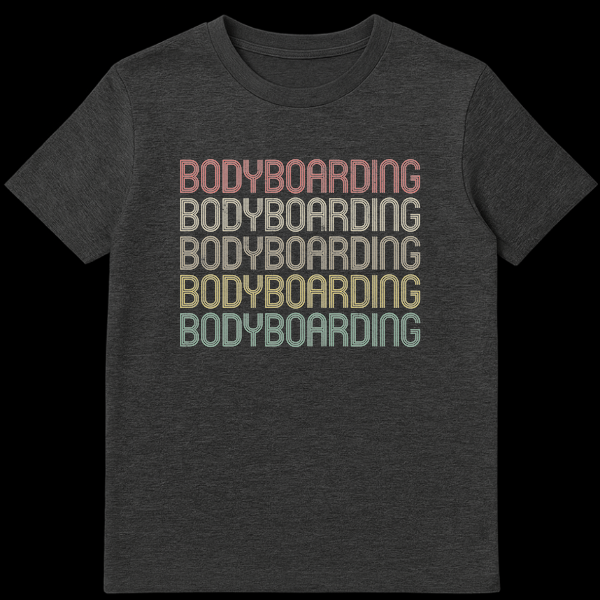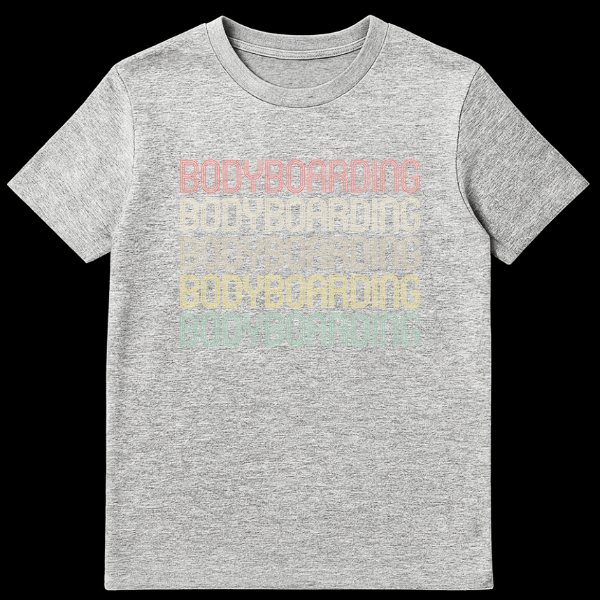 Show your love for the waves with this unique “BODYBOARDING” t-shirt. Featuring the word repeated five times in a vibrant, color-gradient stack, each line transitions through faded reddish-orange, beige, golden yellow, yellowish-green, and teal hues. This eye-catching design captures the spirit of the sport, making it an ideal gift for any passionate bodyboarder or ocean enthusiast.