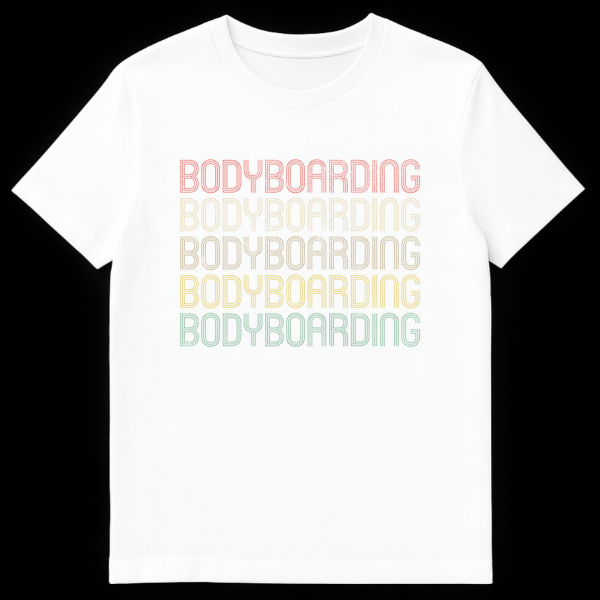 Dive into style with our exclusive “BODYBOARDING” t-shirt, a must-have for anyone who lives for the ocean and the thrill of the ride. The design prominently features the word “BODYBOARDING” repeated five times, stacked vertically, creating a dynamic visual statement. Each repetition boasts a unique color, forming a stunning gradient from top to bottom: starting with a faded reddish-orange/coral, transitioning to a light beige, then a vibrant golden yellow, moving into a cool yellowish-green, and finishing with a deep teal/blue-green. This colorful progression symbolizes the diverse beauty of the ocean. It’s the perfect way to express your passion for water sports and wave riding, making it an excellent present for birthdays, holidays, or just because for the dedicated bodyboarder, surfer, or beach lover in your life.