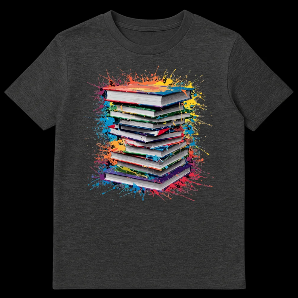 Celebrate your passion for literature with this vibrant t-shirt, showcasing a dynamic stack of books bursting with colorful paint splatters. This eye-catching design is a visual metaphor for the exciting, expressive world that books open up. It’s the perfect gift for bookworms, students, librarians, or anyone who believes reading truly colors their world.