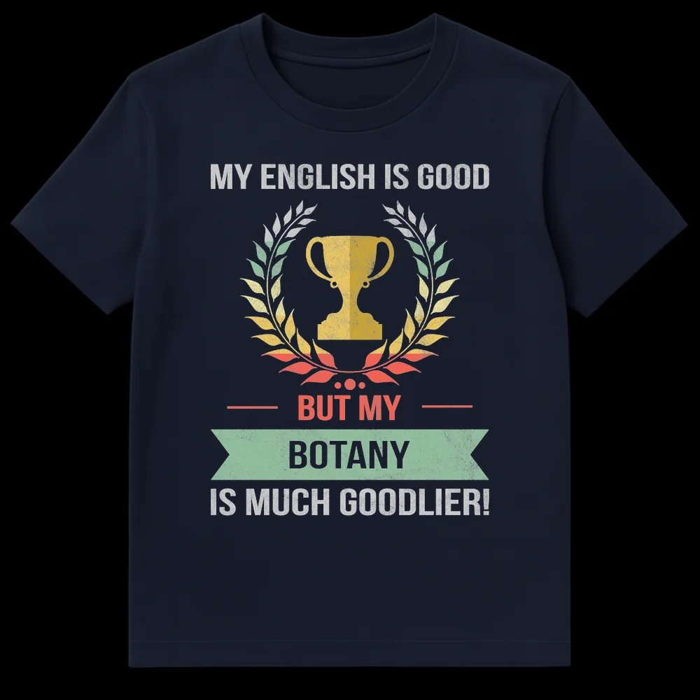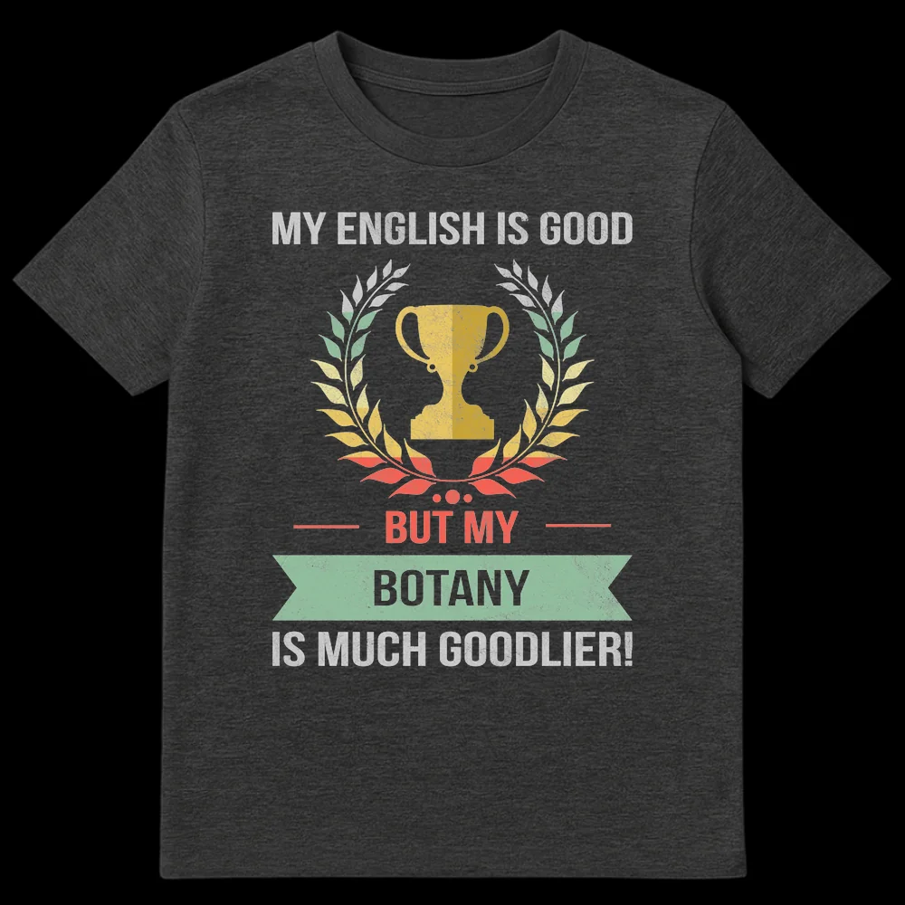 Celebrate your love for flora with a witty twist on words! This t-shirt features the humorous text “MY ENGLISH IS GOOD BUT MY BOTANY IS MUCH GOODLIER!” playing on a clever, self-aware pun for plant enthusiasts. Adorned with a distressed vintage trophy and wreath, it’s a perfect conversation starter. Ideal as a unique gift for gardeners, botanists, or any proud plant parent who appreciates a good linguistic laugh.