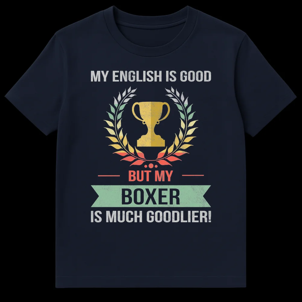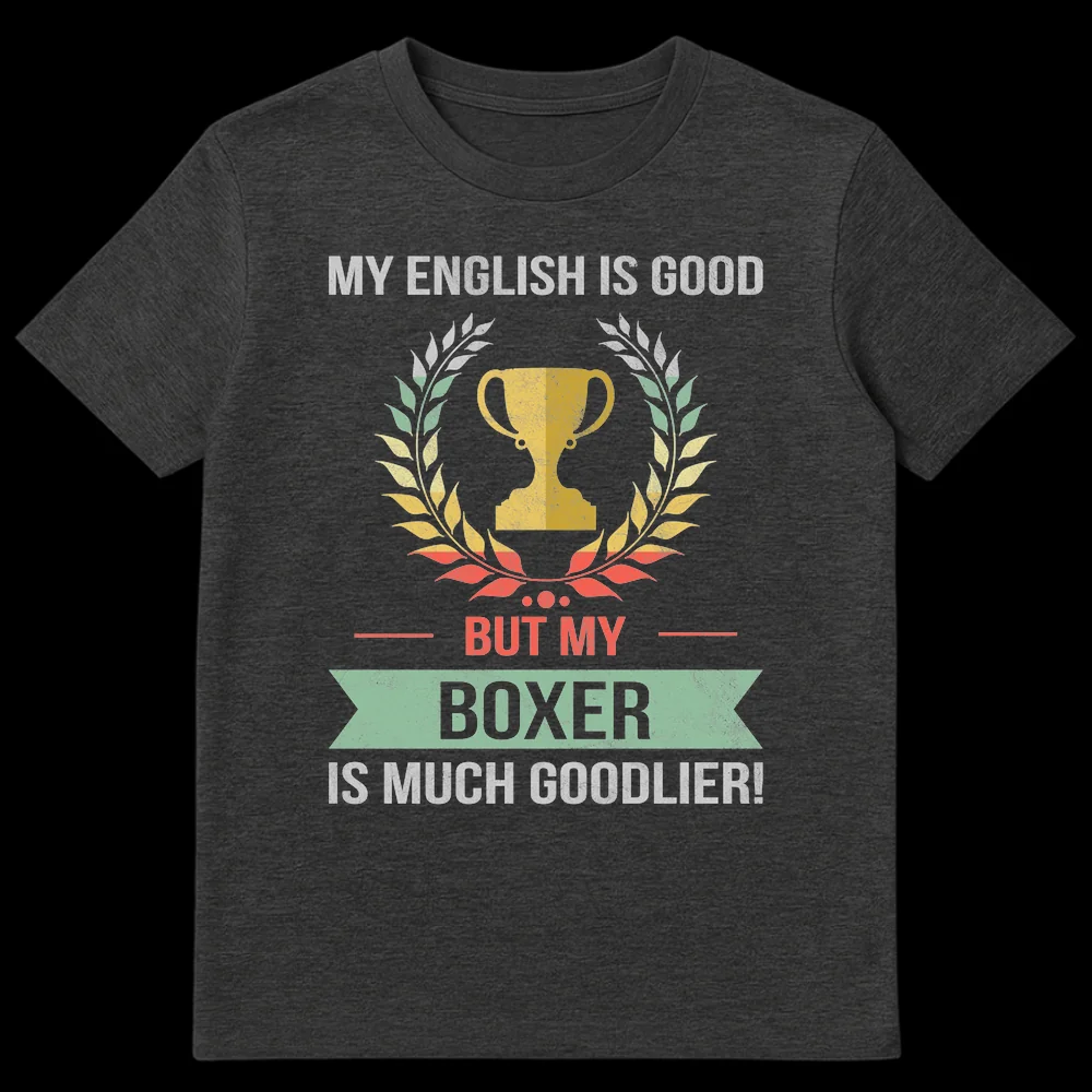 Celebrate your Boxer’s unmatched greatness with this humorous vintage-style t-shirt. Featuring a classic trophy and laurel wreath, the clever text “My English is good, but my Boxer is much goodlier!” playfully uses an intentional grammatical quirk to declare your pet’s superiority. This unique design is a perfect gift for any proud Boxer dog owner, blending self-deprecating humor with deep canine affection.