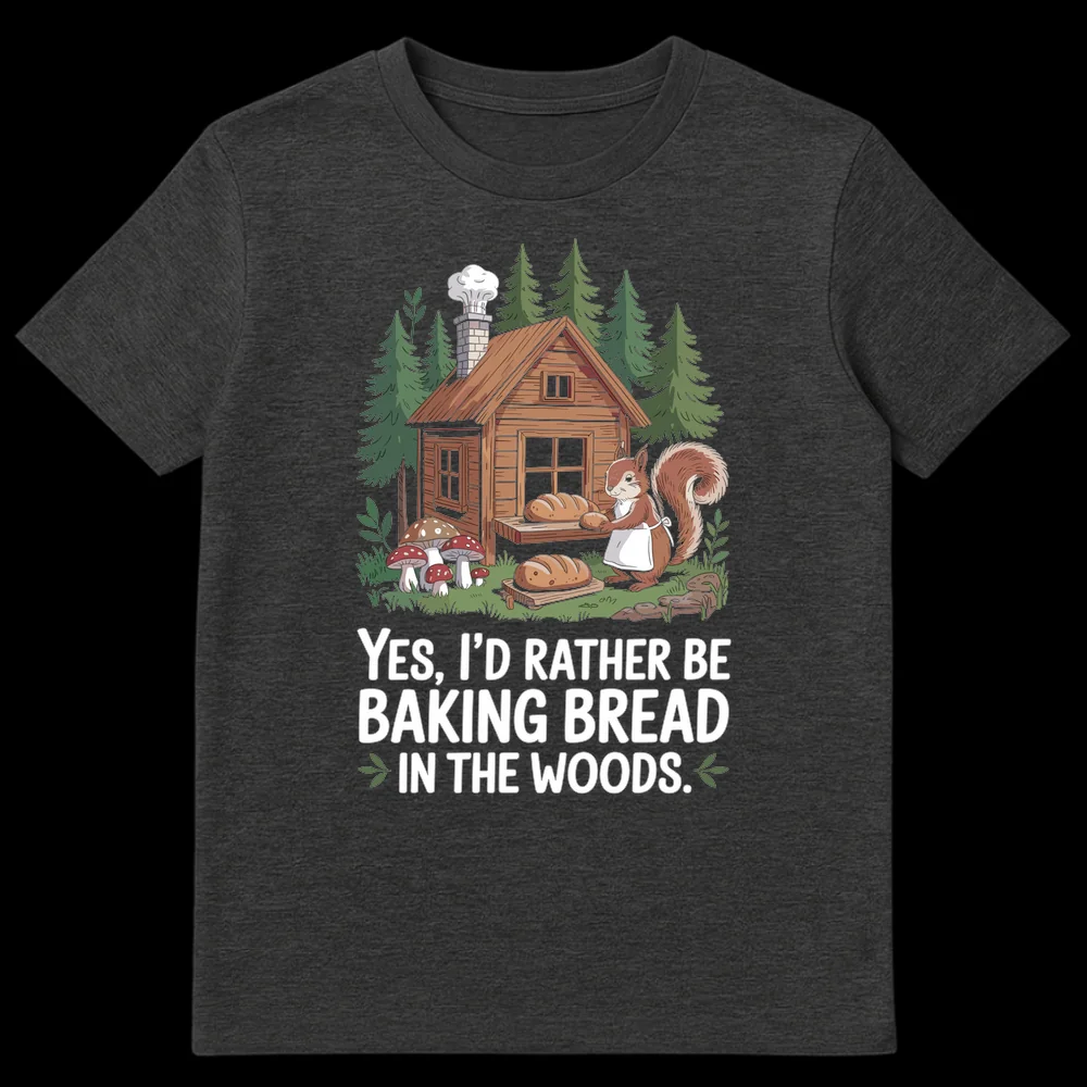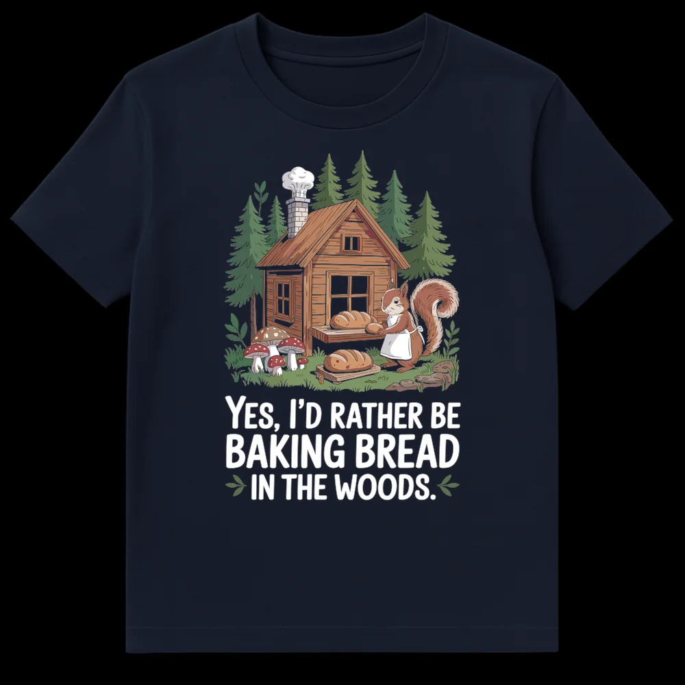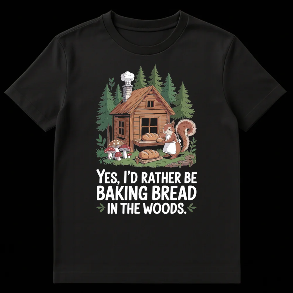 Escape the daily grind with our charming ‘YES, I’D RATHER BE BAKING BREAD IN THE WOODS’ t-shirt. This design features a whimsical squirrel baking in a rustic cabin, perfectly capturing the dream of serene, nature-filled baking. It’s an ideal humorous statement for anyone who longs for a simpler life and the comforting aroma of fresh bread. A perfect gift for home bakers, nature lovers, or cottagecore enthusiasts.