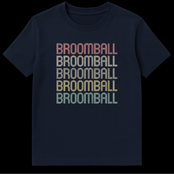 Show off your passion for the rink with this unique Broomball t-shirt, designed for true enthusiasts. The word “BROOMBALL” is boldly stacked five times, each layer presented in a distinct, multi-line outlined style that catches the eye. The vibrant color gradient—from a warm coral at the top, through cream and golden yellow, to a cool teal and mint green at the bottom—adds a stylish touch that stands out. This shirt isn’t just clothing; it’s a statement for anyone who loves the thrill of the game. It makes an excellent gift for broomball teammates, coaches, or fans, sure to be a hit on and off the ice. Crafted for comfort and style, it’s a must-have for your broomball gear collection.