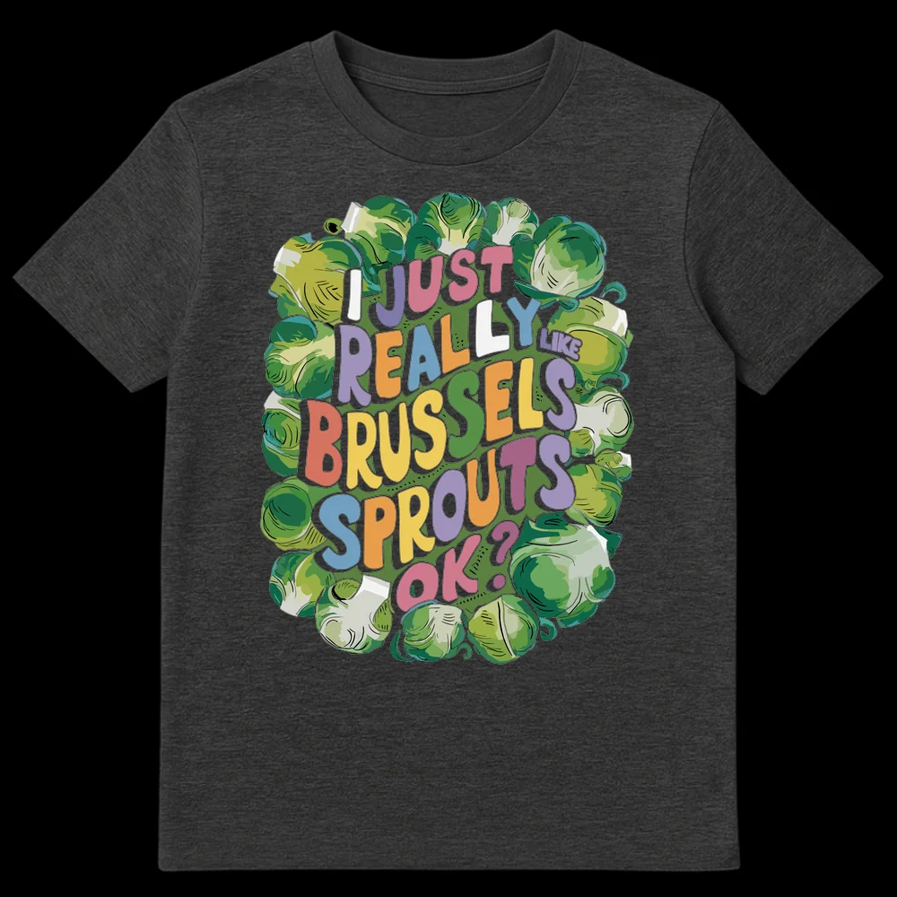 Embrace your unique taste with this hilarious “I JUST REALLY LIKE BRUSSELS SPROUTS OK?” t-shirt. Featuring a retro cartoon style with vibrant, hand-drawn typography framed by stylized Brussels sprouts, this design playfully asserts your love for the polarizing veggie. It’s the perfect statement piece for foodies and anyone with a quirky sense of humor, making it an ideal gift for the Brussels sprouts lover in your life.