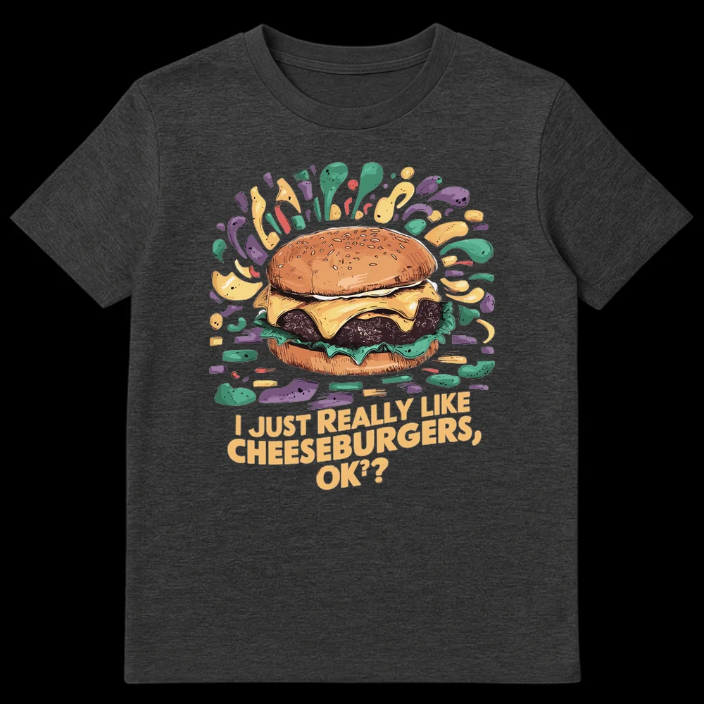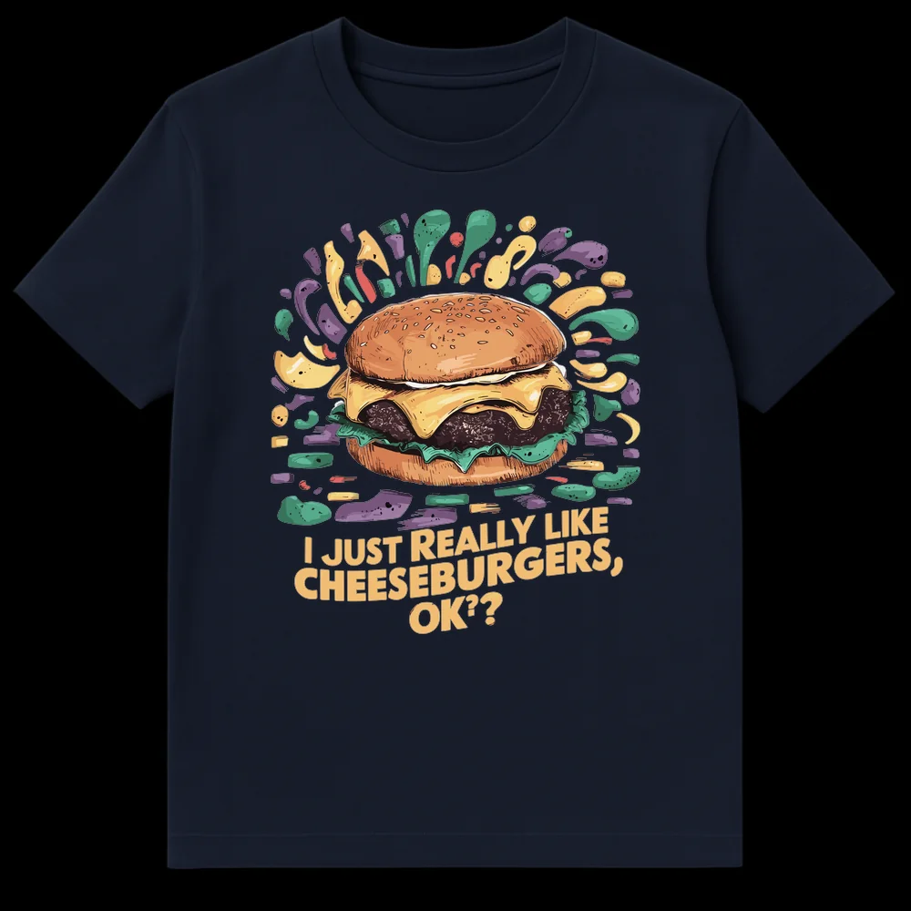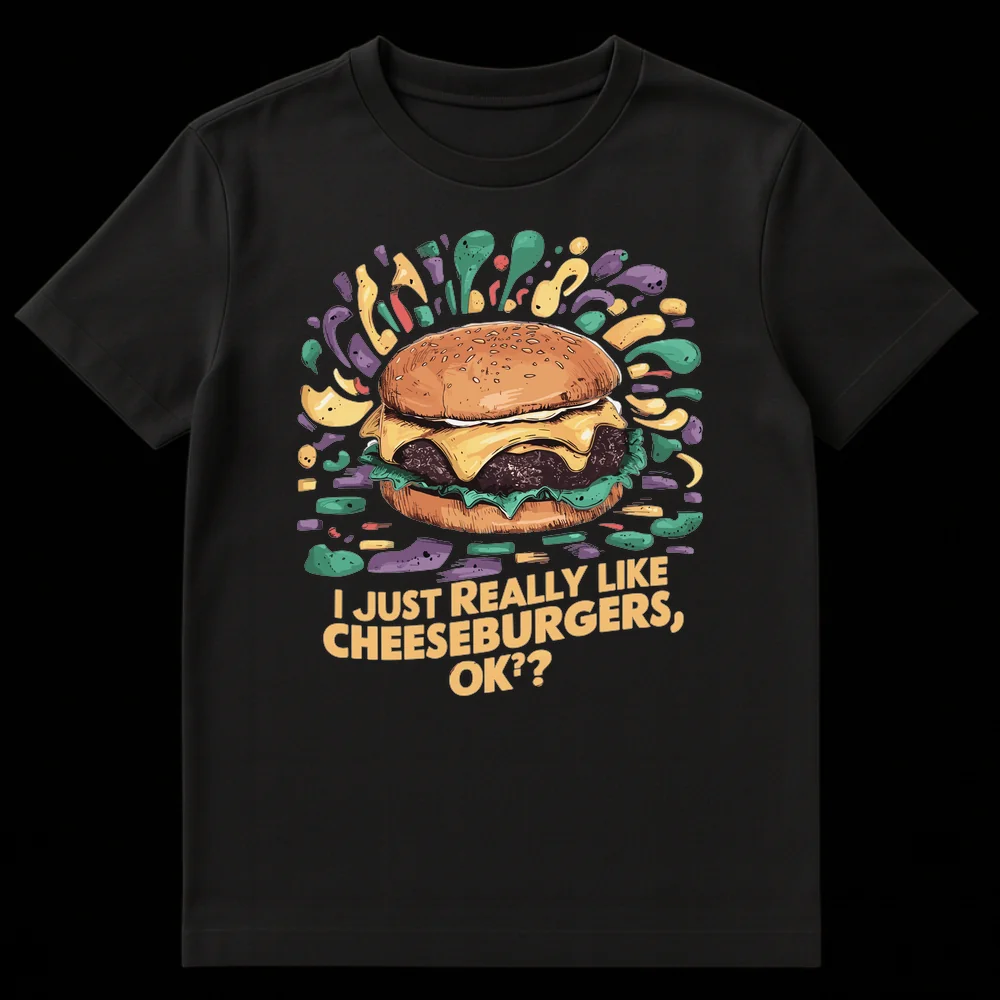 Declare your love for the ultimate comfort food with our “I JUST REALLY LIKE CHEESEBURGERS, OK??” tee. This design features a mouth-watering, hand-drawn cheeseburger illustration, surrounded by vibrant, abstract flavor explosion elements. It’s a humorous, relatable statement for anyone who genuinely loves cheeseburgers and isn’t afraid to show it. A perfect gift for foodies, burger lovers, or anyone with a lighthearted sense of humor.