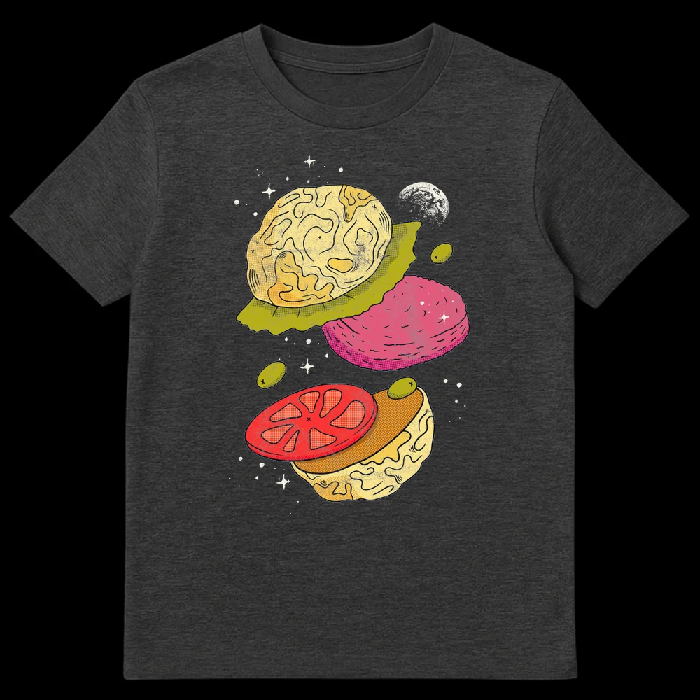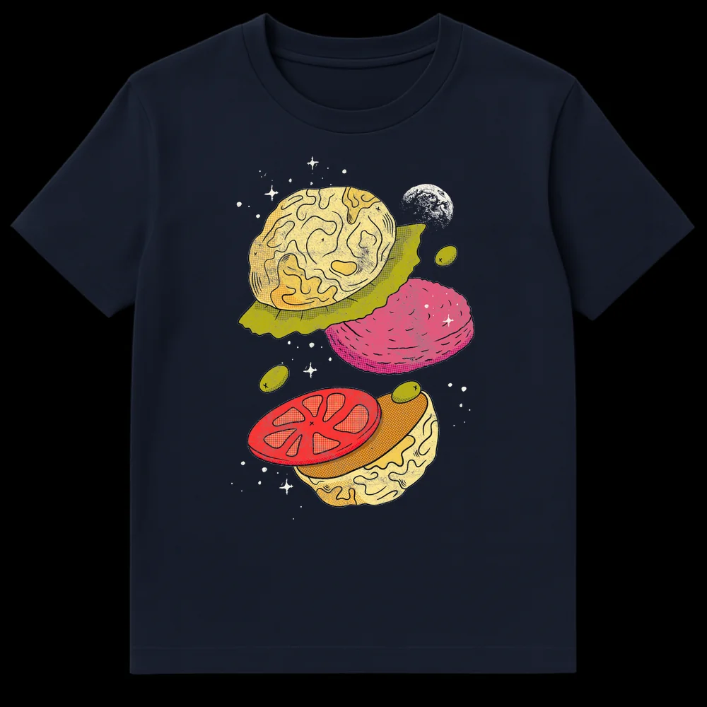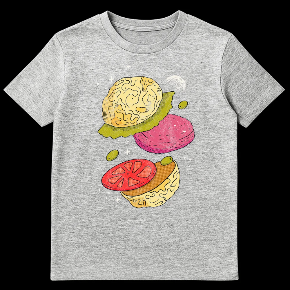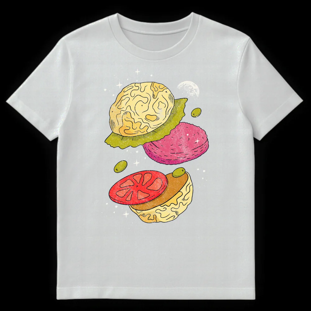 Dive into the cosmos with our unique “Mind-Blowing Burger” t-shirt, where deconstructed burger elements float as celestial brains in space. This design playfully combines food and thought with a whimsical, retro comic art style. Perfect for foodies, sci-fi fans, or anyone who loves clever visual puns and a touch of the absurd.