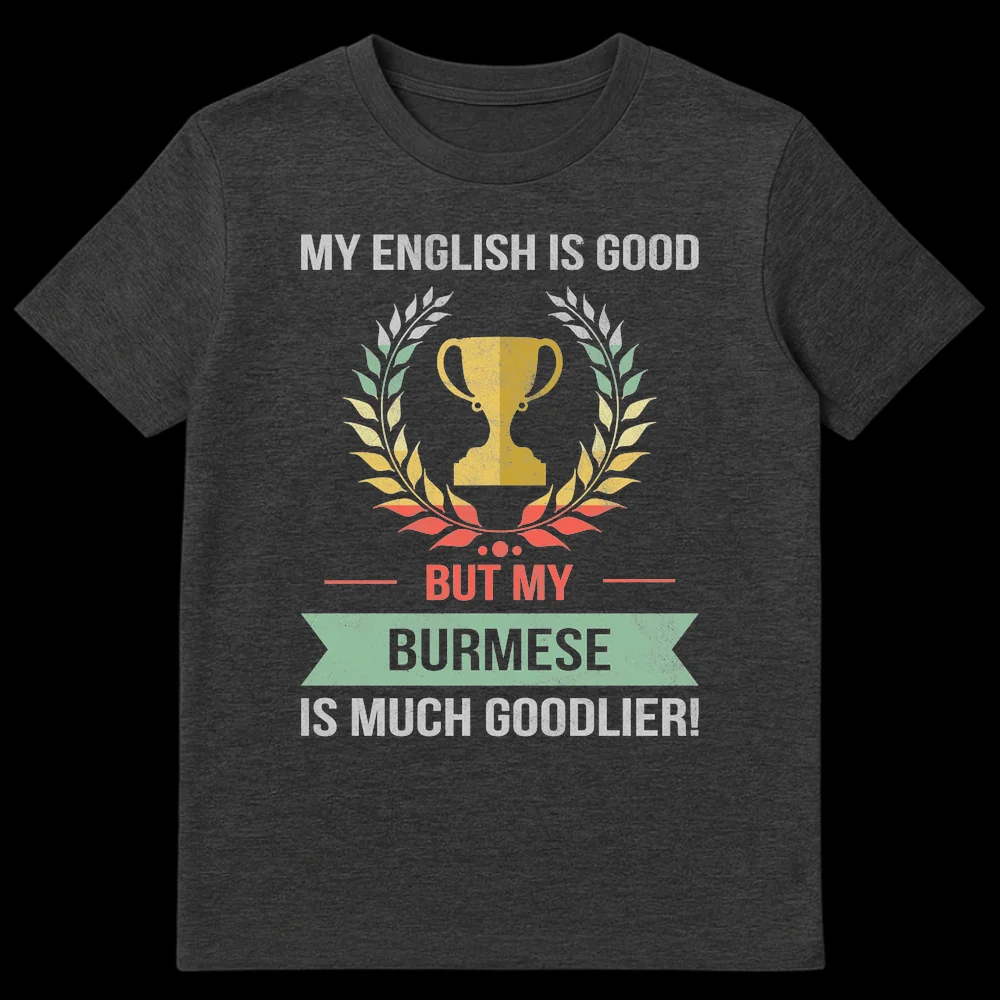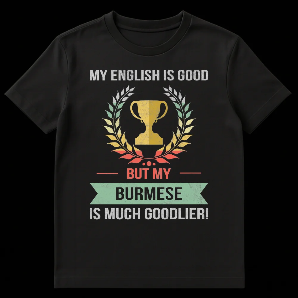 Celebrate your Burmese heritage and linguistic wit with this unique t-shirt. Featuring the playful phrase “MY ENGLISH IS GOOD BUT MY BURMESE IS MUCH GOODLIER!” alongside a vintage trophy design, it’s a humorous nod to mastering your native language. This design is perfect for proud Burmese speakers, language enthusiasts, or anyone who appreciates a clever cultural jest, making it an excellent gift.