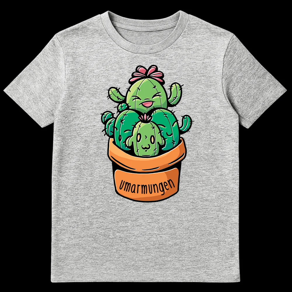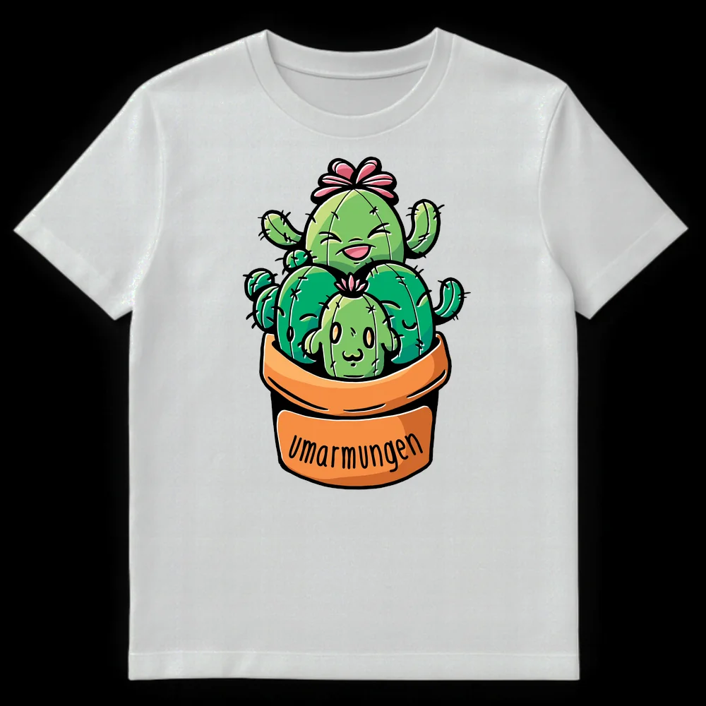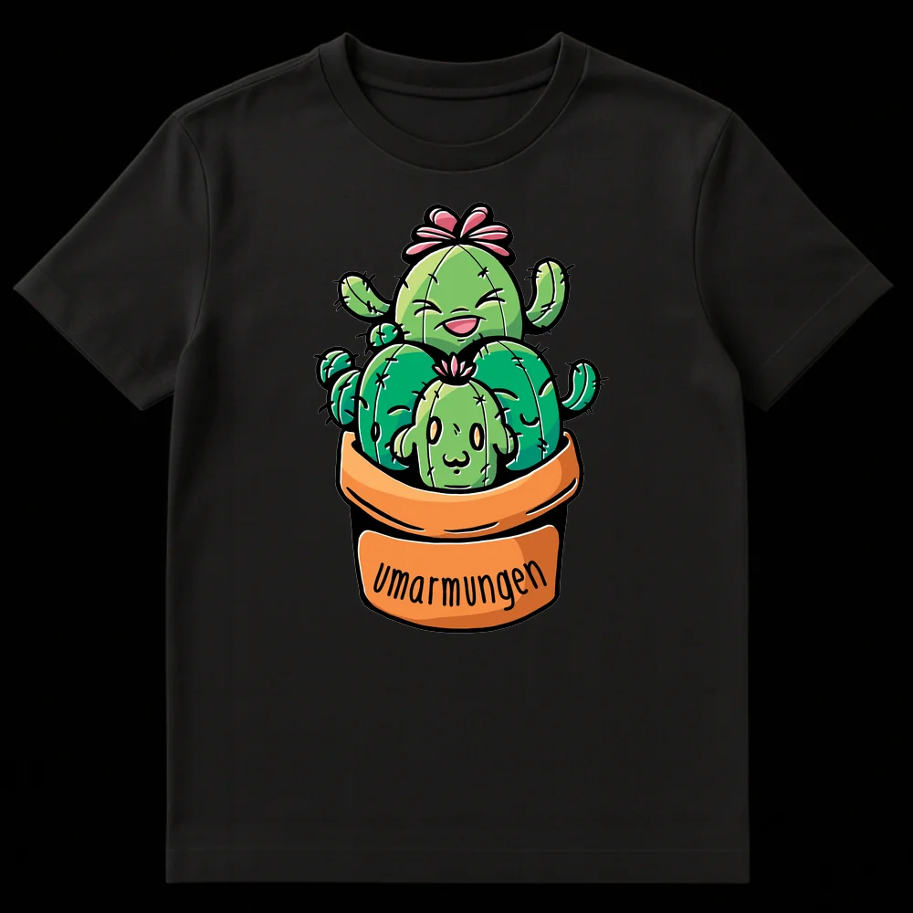 Embrace the adorable irony with our ‘Umarmungen’ (German for ‘hugs’) cactus tee. This whimsical design features cute, friendly cacti reaching out for a cuddle, playfully contradicting their prickly nature. It’s the perfect gift for plant lovers and anyone who appreciates wholesome, humorous, and kawaii-inspired art.