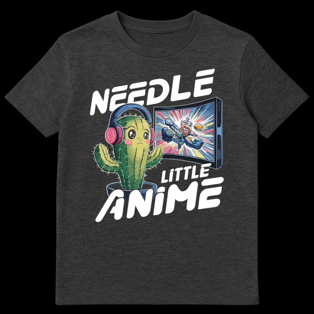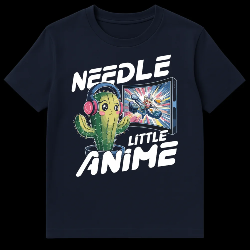 Embrace your love for Japanese animation with our adorable “Needle Little Anime” t-shirt. This design features a cute, headphone-wearing cactus intently watching an action-packed anime scene, cleverly punning on “I need a little anime.” It’s a perfect blend of Kawaii aesthetic and anime passion, making it an ideal gift for fellow otaku and plant enthusiasts.