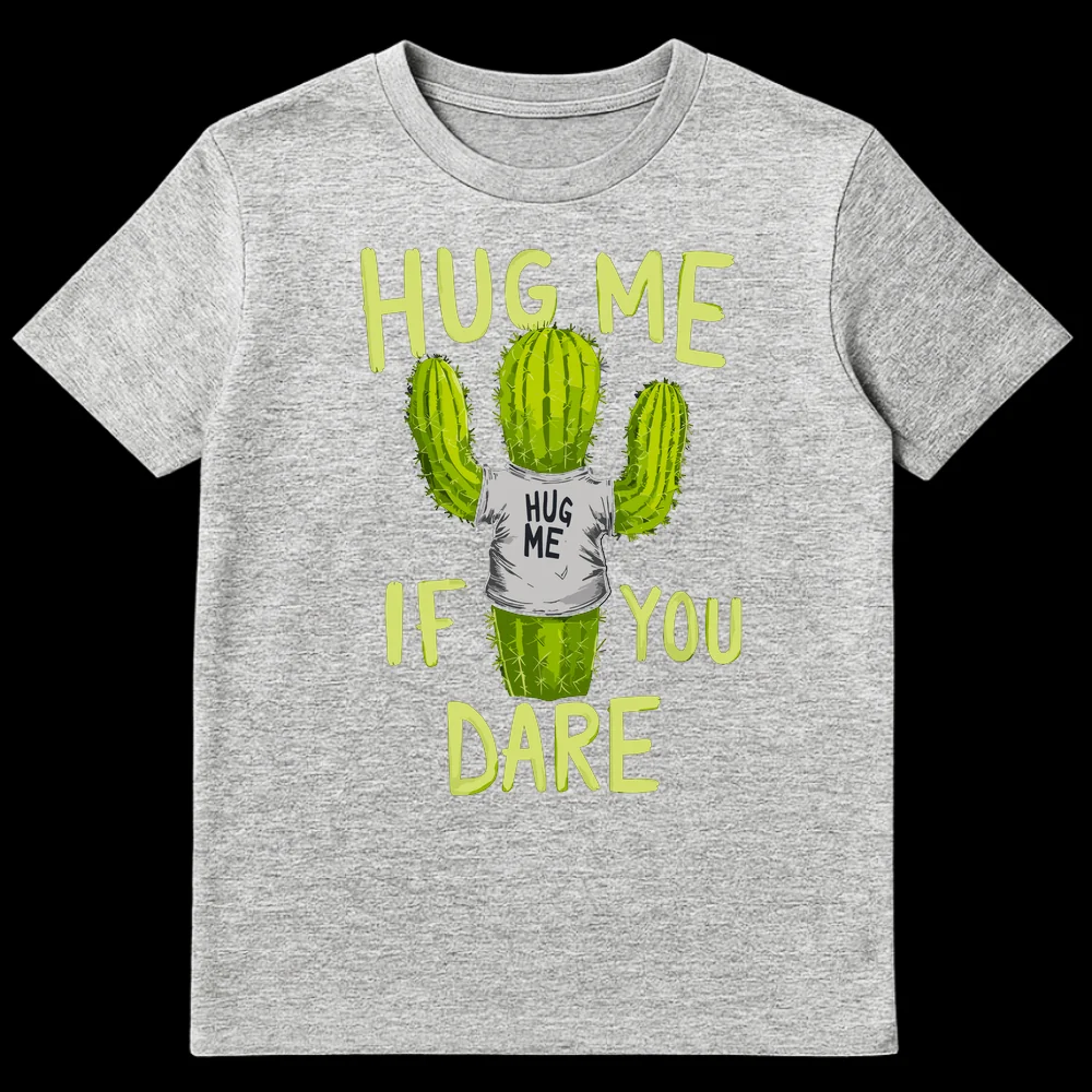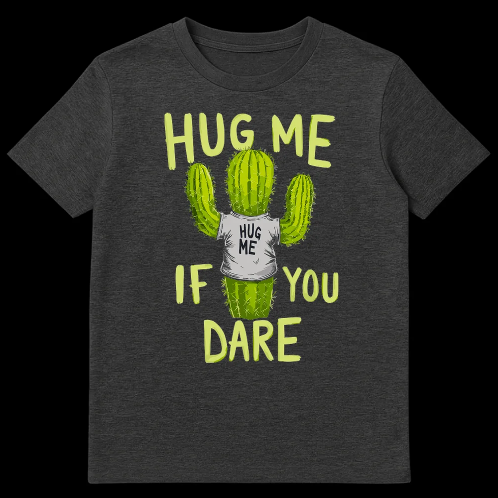 Embrace your inner cactus with this uniquely funny t-shirt! The design showcases a charmingly grumpy yet inviting cartoon cactus, complete with the main text “HUG ME IF YOU DARE” and a smaller, equally cheeky “HUG ME” on the cactus’s own tiny tee. This brilliant visual pun captures the humor of a lovable but unapproachable plant, making it an instant hit. It’s perfect for those who appreciate dry wit, a bit of sarcasm, or identify with having a ‘tough exterior, soft interior.’ Crafted for comfort and style, this shirt is an excellent way to express your personality or gift to the plant parent, succulent lover, or introverted friend in your life who loves a good laugh. Stand out with this amusing and relatable plant humor tee!