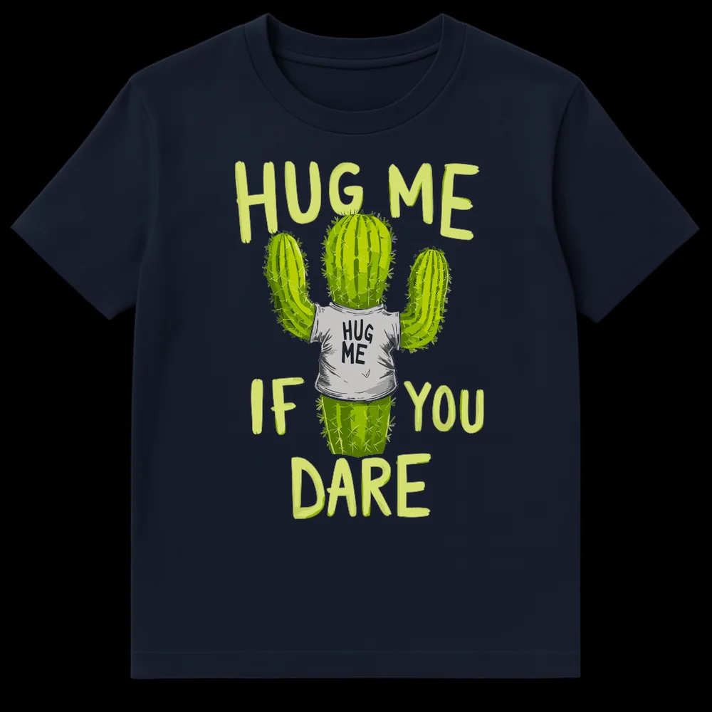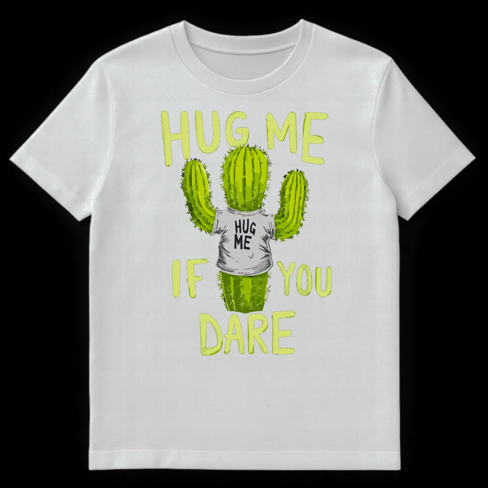 Dare to hug this hilarious cartoon cactus! Featuring the bold challenge “HUG ME IF YOU DARE” and a little cactus wearing its own “HUG ME” shirt, this design playfully combines sharp wit with an adorable plant. It’s a perfect conversation starter for anyone with a prickly exterior and a soft spot for humor, making it an ideal gift for plant enthusiasts, introverts, or fans of ironic jokes.