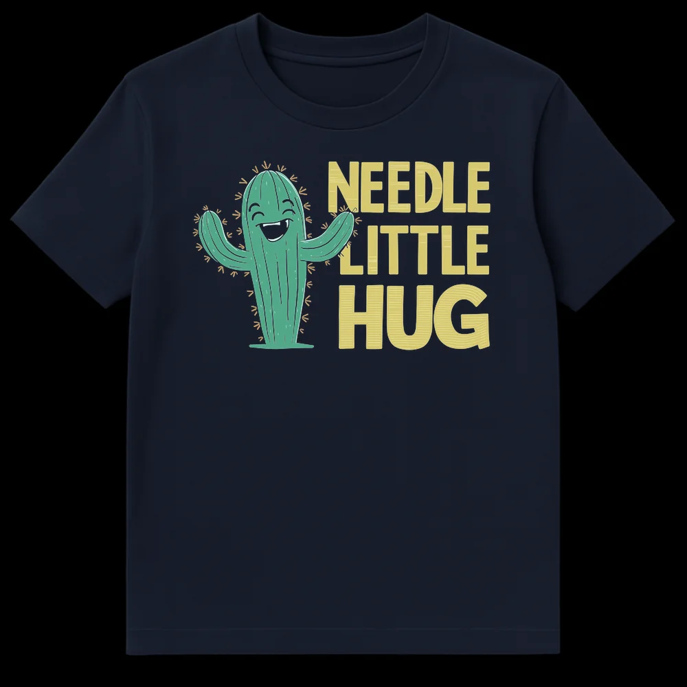 Embrace the fun with our ‘NEEDLE LITTLE HUG’ t-shirt, featuring a charming, anthropomorphic cactus extending its arms for a squeeze. This witty design plays on the classic phrase, turning the cactus’s ‘needles’ into a hilarious and endearing desire for affection. It’s the perfect lighthearted gift for plant lovers, succulent enthusiasts, or anyone who appreciates a good pun.