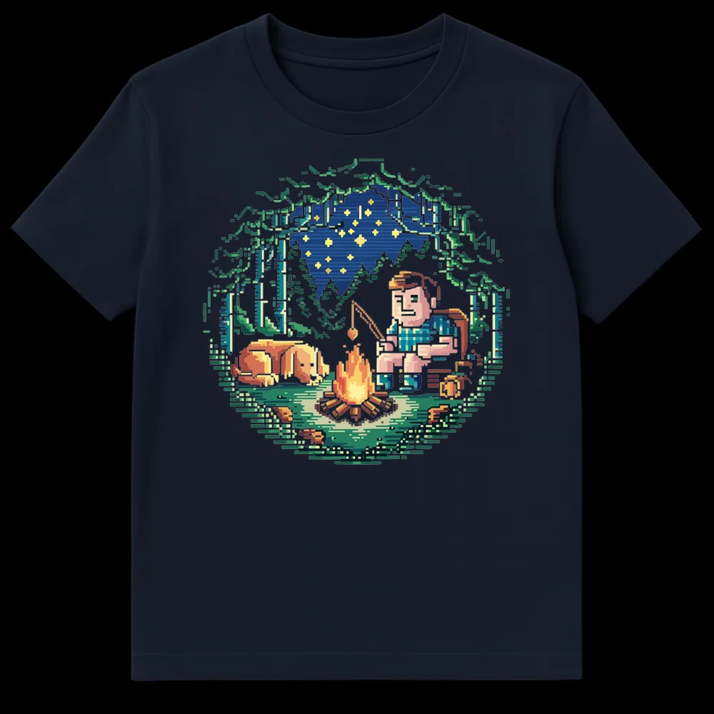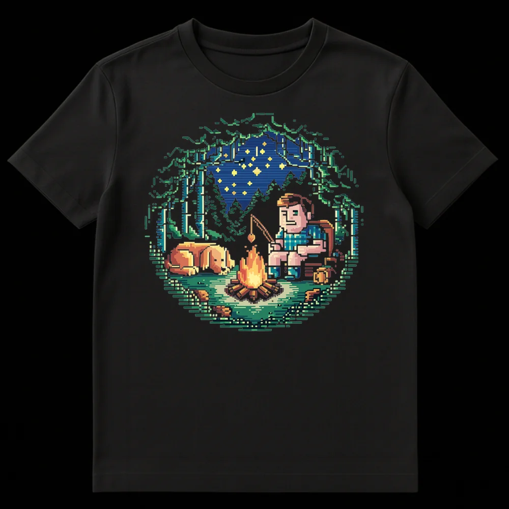 Embrace cozy nights with this unique pixel art t-shirt, depicting a camper “fishing” for a warm heart in a campfire with their loyal dog. This endearing design captures the essence of companionship and comfort, blending retro gaming aesthetics with a wholesome outdoor theme. It’s a perfect gift for gamers, dog lovers, and anyone who cherishes peaceful camping moments and subtle humor.