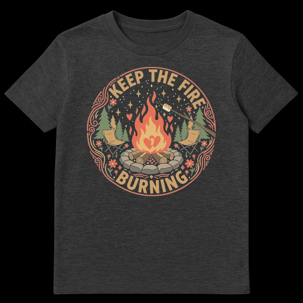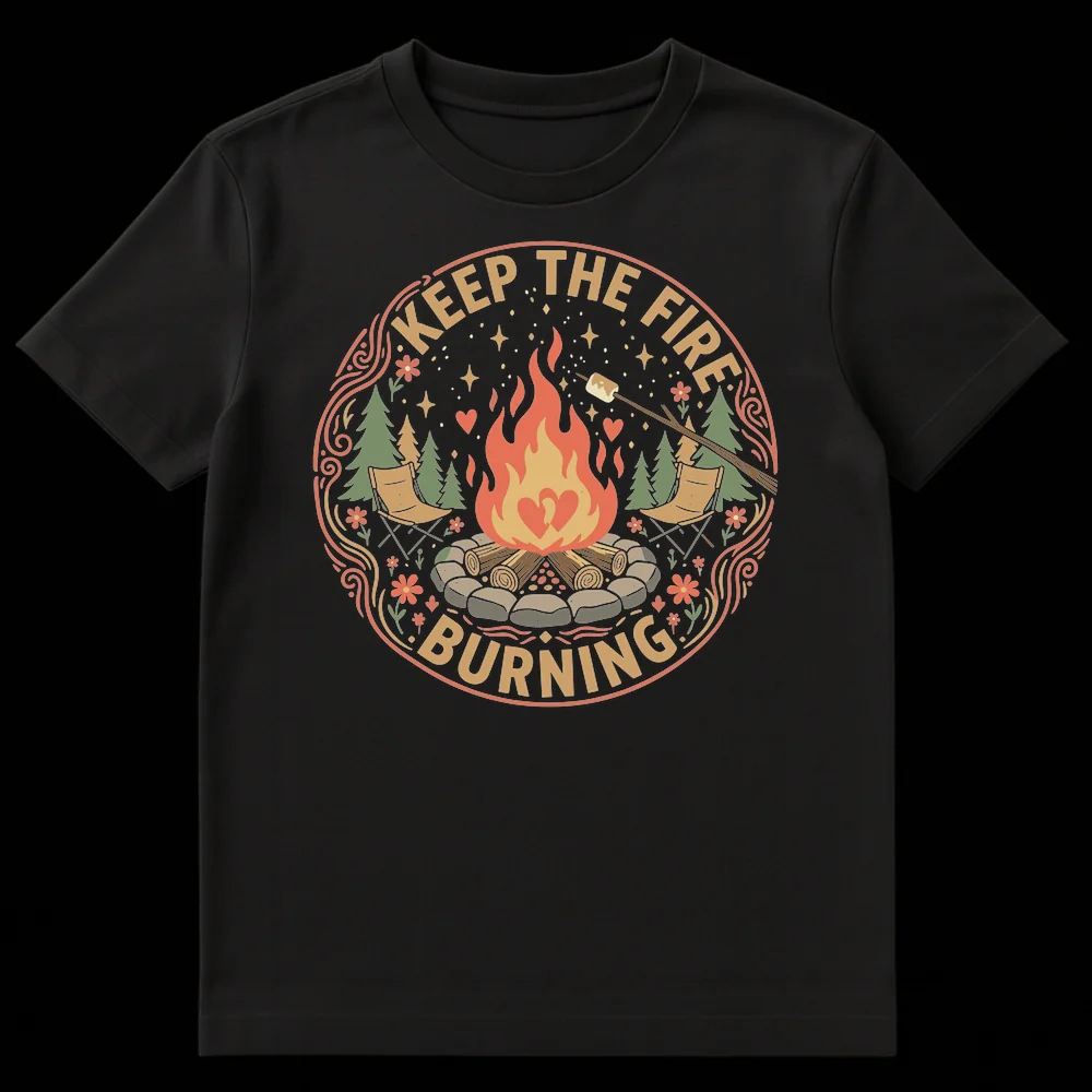 Embrace the spirit of adventure and lasting connections with this captivating campfire tee. Featuring the uplifting message “KEEP THE FIRE BURNING” alongside a cozy scene of a roaring fire, two chairs, and subtle hearts, it symbolizes passion and togetherness. This design is perfect for camping lovers, couples, or anyone who cherishes warmth and enduring bonds.