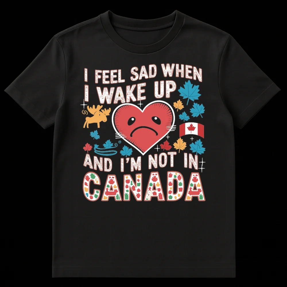 Wake up with a smile, even if you’re not in Canada, by wearing this unique t-shirt! The playful design, centered around the relatable phrase “I FEEL SAD WHEN I WAKE UP AND I’M NOT IN CANADA,” is a fun expression of national pride and longing. It features a distressed, bold text style paired with a cute, sad heart, a majestic moose, and beautifully rendered maple leaves in various colors. The highlight is the word ‘CANADA,’ crafted from a mosaic of smaller Canadian symbols like beavers, canoes, and pine trees, making it a true conversation starter. This tee is perfect for Canadians living abroad, proud citizens showing their love, or anyone who deeply cherishes Canada and its culture. It’s a fantastic way to celebrate your connection to the country or to give a thoughtful, humorous gift to a fellow Canada enthusiast.
