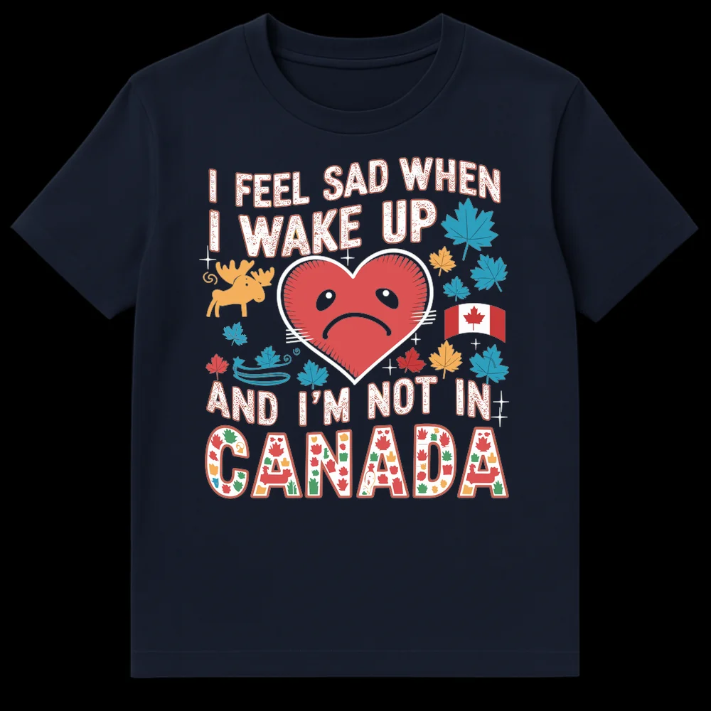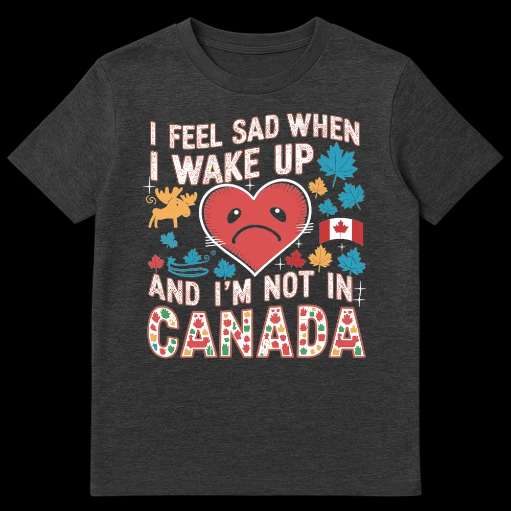 Express your love for the Great White North with this heartfelt “I FEEL SAD WHEN I WAKE UP AND I’M NOT IN CANADA” t-shirt. Featuring a playful sad heart, iconic maple leaves, a charming moose, and vibrant mosaic ‘CANADA’ lettering, this design perfectly captures that longing for home. It’s an ideal gift for Canadian expats, proud citizens, or anyone who dreams of being in Canada.