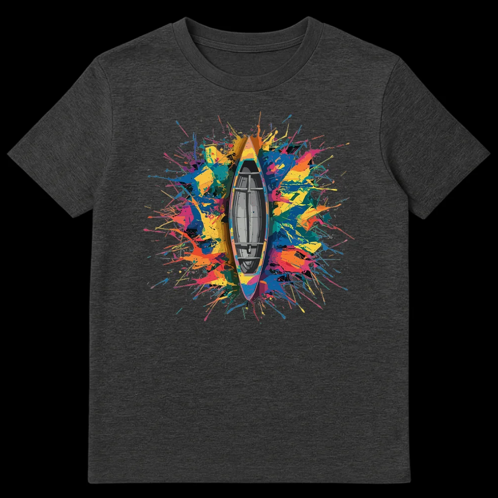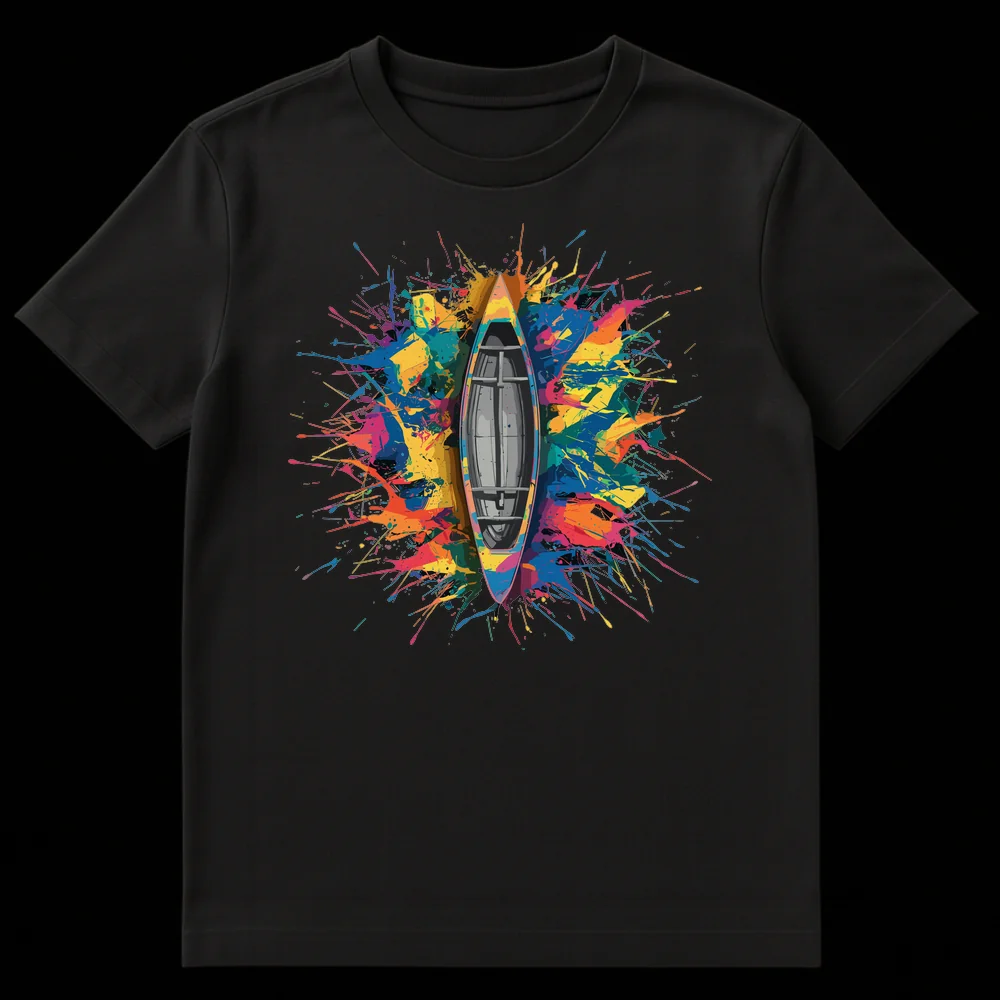 Dive into vibrant style with our Colorful Splatter Canoe T-Shirt. This unique design features a stylized canoe emerging from an explosion of multi-colored paint splatters against a deep black background, creating an energetic abstract art statement. It’s a striking piece for anyone who loves water sports, abstract art, or making a bold fashion statement. Perfect gift for canoeists, kayakers, or creative individuals who appreciate dynamic aesthetics.