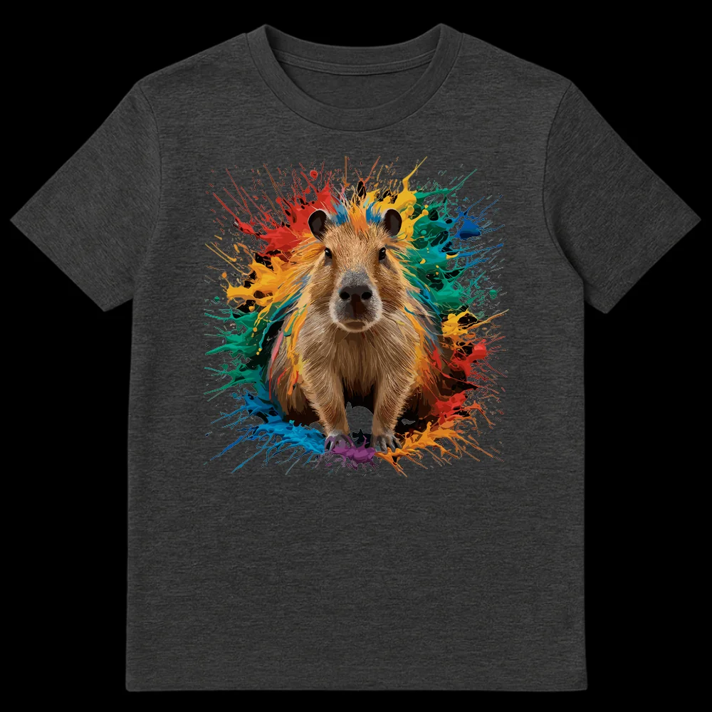 Celebrate the world’s chillest rodent with our Vibrant Capybara Paint Splatter T-Shirt. This unique design showcases a calm capybara enveloped in a dynamic burst of multi-colored paint, creating an eye-catching, artistic statement. The lively rainbow palette pops against the dark background, making it a perfect gift for capybara fans, animal lovers, or anyone who appreciates expressive wildlife art.