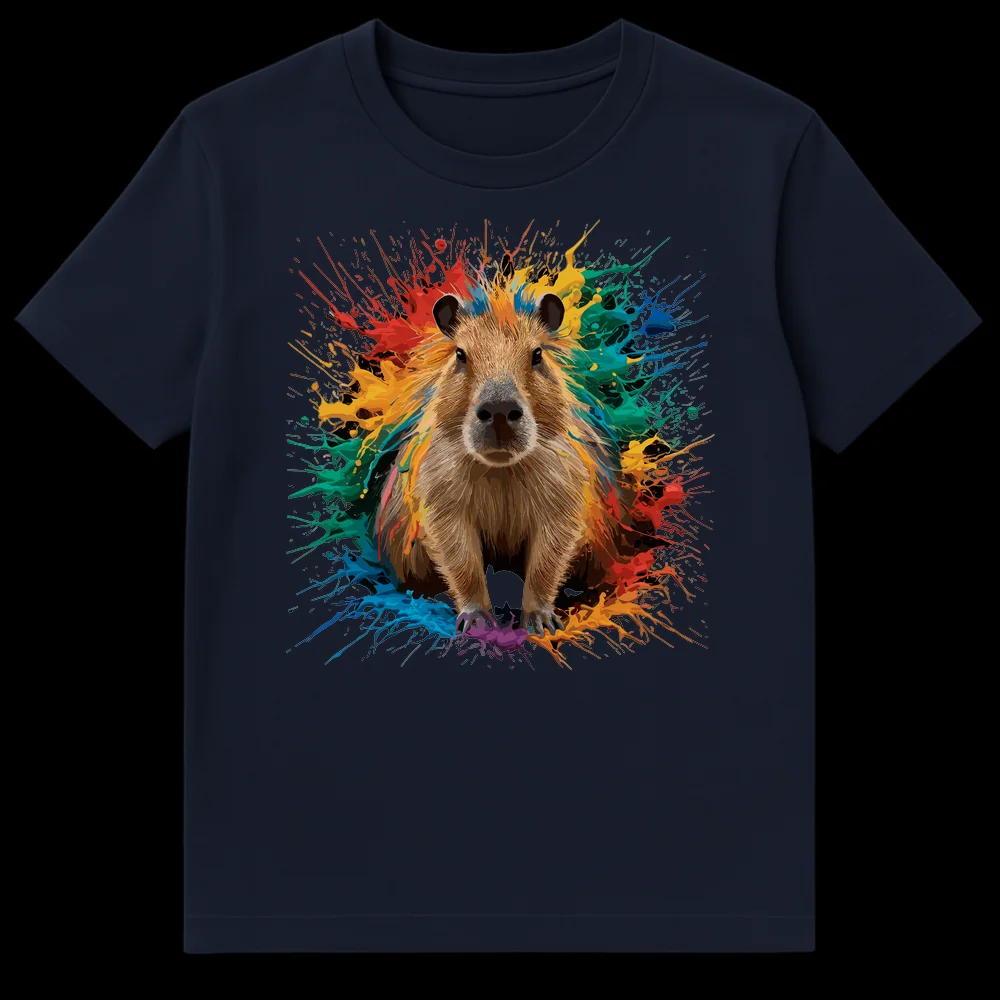 Unleash your inner capybara fan with this captivating t-shirt design, celebrating the serene charm of the largest living rodent. Our Vibrant Capybara Paint Splatter T-Shirt features a meticulously illustrated capybara, rendered with naturalistic detail, beautifully contrasted by an explosion of dynamic, multi-colored paint splatters. This striking digital illustration boasts a full-spectrum rainbow of bright reds, oranges, yellows, greens, blues, and purples, creating a joyful and energetic aura around the calm capybara, all set against a bold black background for maximum visual impact. It’s more than just a shirt; it’s a wearable piece of art that embodies the appreciation for this unique animal’s cool and friendly vibe. There’s no explicit humor, just pure celebration of the capybara’s endearing presence. This tee is an ideal gift for capybara enthusiasts, animal lovers, young adults, teens, and anyone who loves vibrant, expressive, and conversation-starting apparel. Show off your individuality and passion for these gentle giants with a design that’s as unique and lovable as the capybara itself.