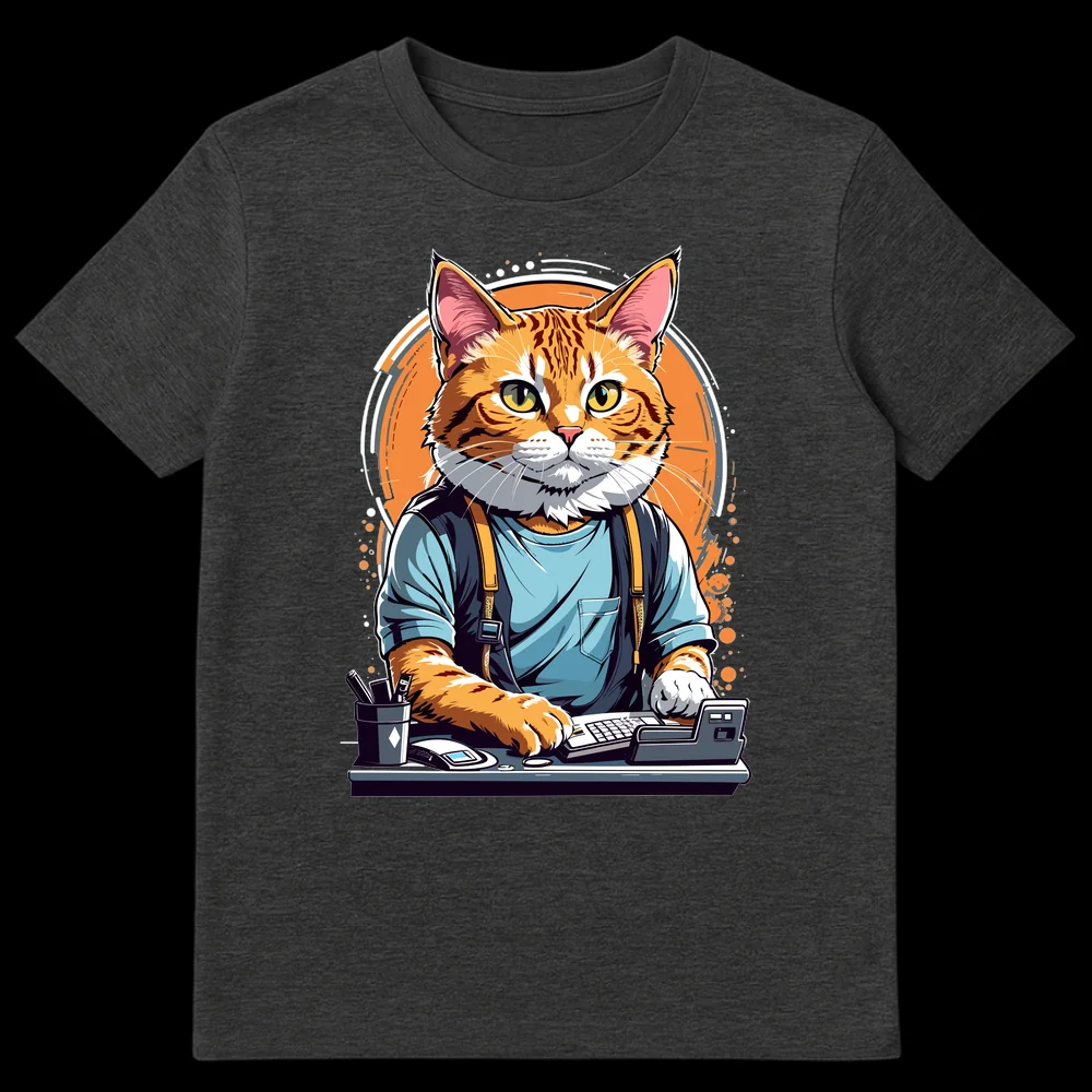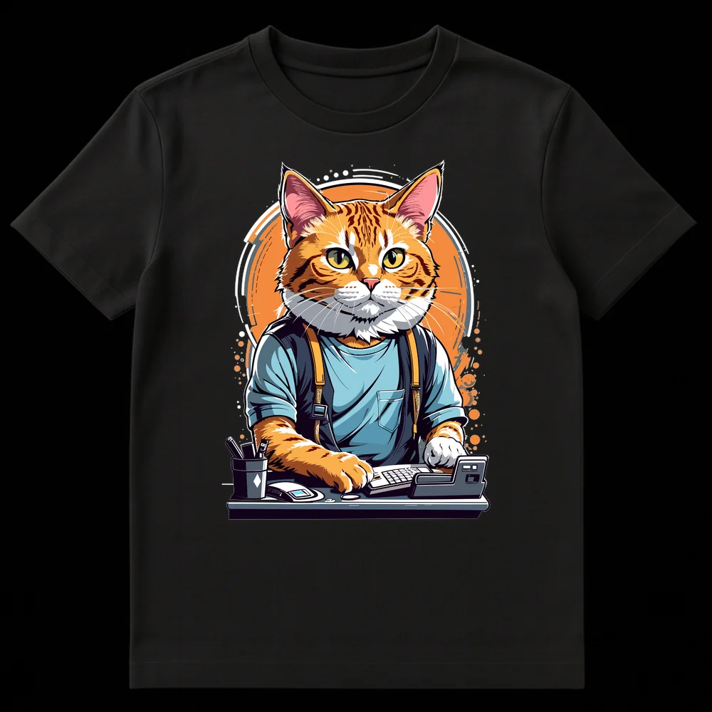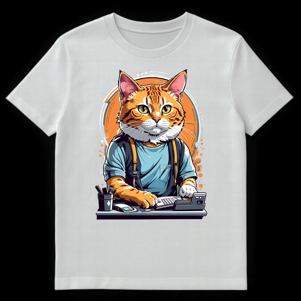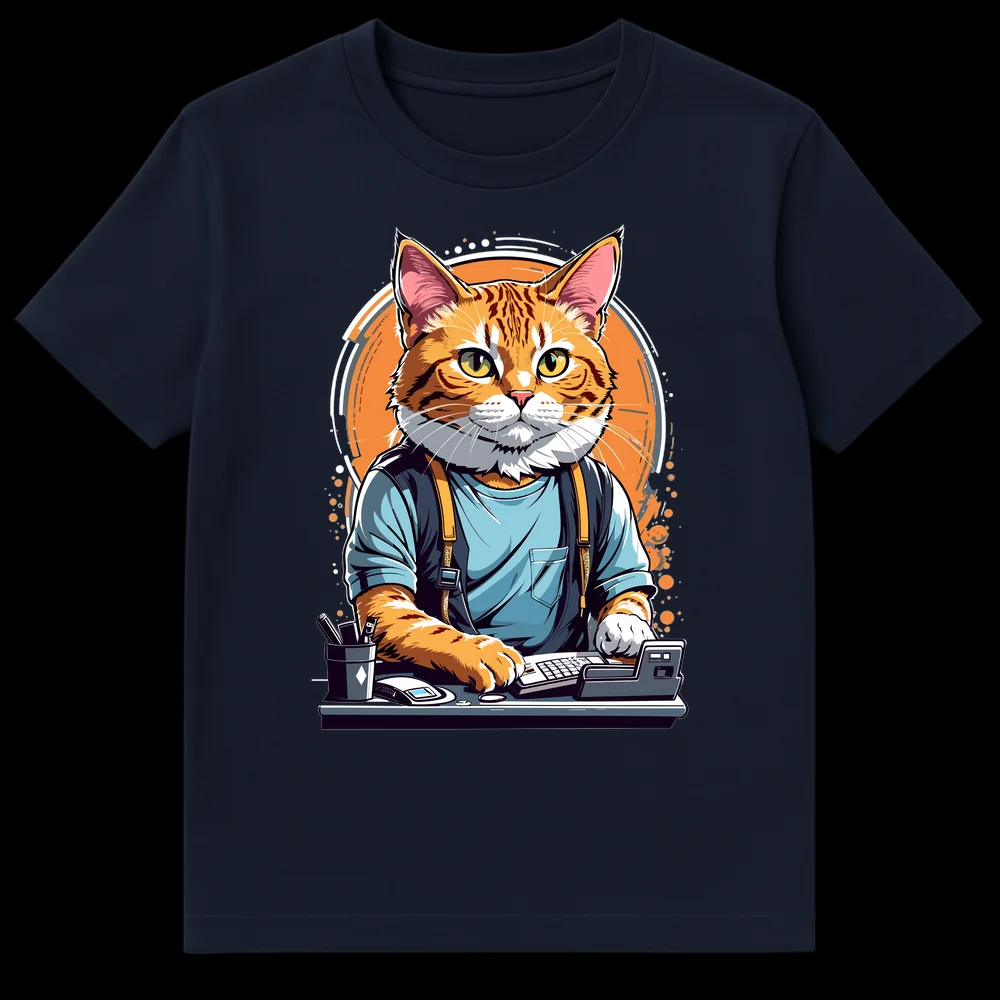 Dive into the whimsical world of a diligent feline with our ‘Cat Accountant’ t-shirt. This design showcases an adorable orange tabby, seriously focused at its desk, paws on the keyboard and cash register. It’s a charming visual pun on the ‘busy cat’ trope, perfect for anyone who loves cats or appreciates a humorous take on the daily grind. An ideal gift for cat owners, office workers, or tech enthusiasts.