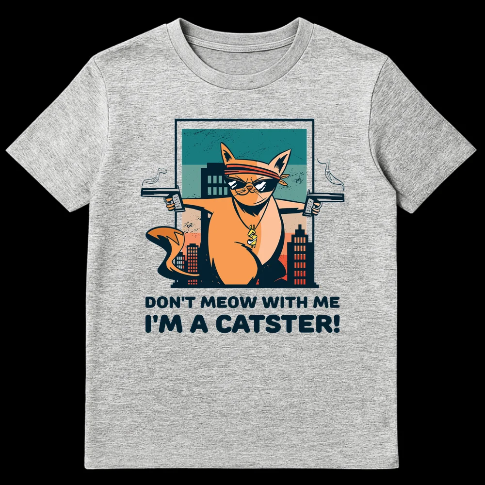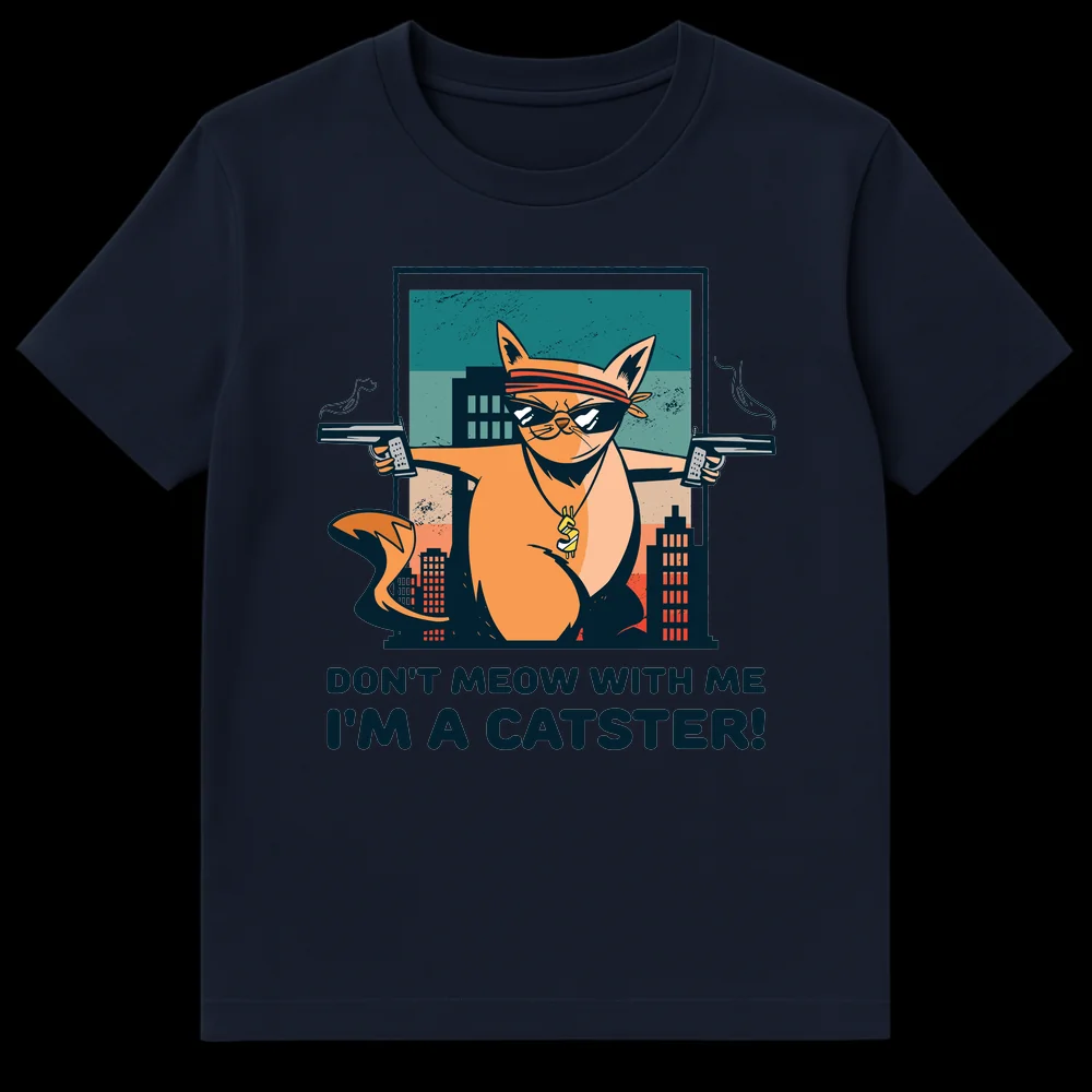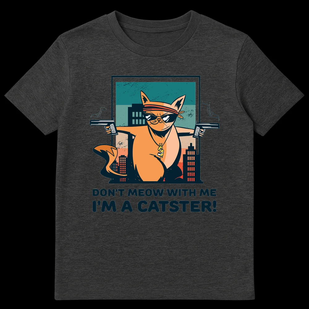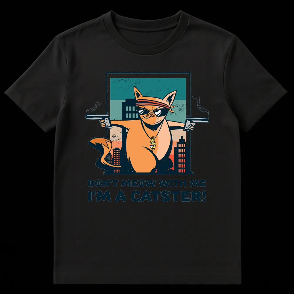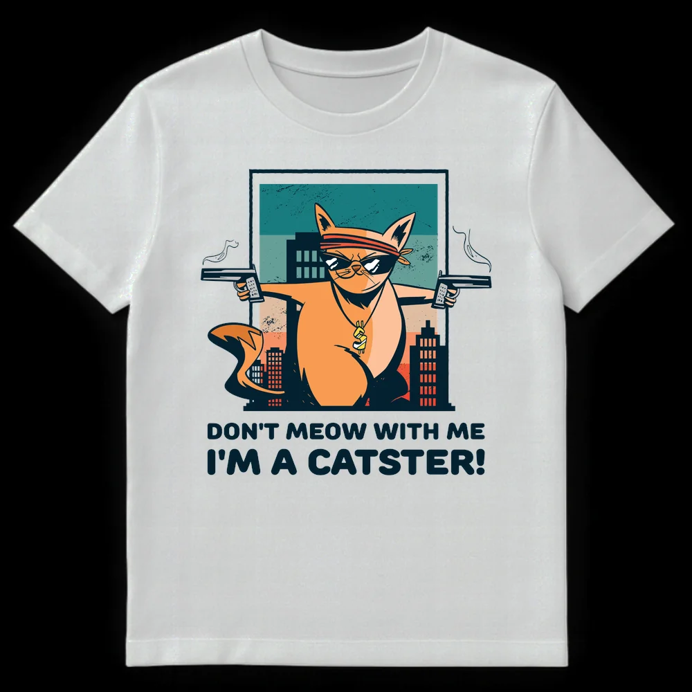 Unleash your inner ‘Catster’ with this uniquely humorous t-shirt! Featuring a cartoonishly tough cat sporting a bandana, cool shades, and a bling dollar sign chain, all while dual-wielding pistols with smoking barrels. The clever pun “DON’T MEOW WITH ME I’M A CATSTER!” playfully subverts gangster tropes with a feline twist, making it a guaranteed conversation starter. This design is perfect for cat enthusiasts who love a good laugh, appreciate pop culture references, or enjoy expressing a sassy, confident attitude. It’s an unforgettable gift for friends and family who adore their pets but also appreciate a touch of irreverent, action-packed humor.