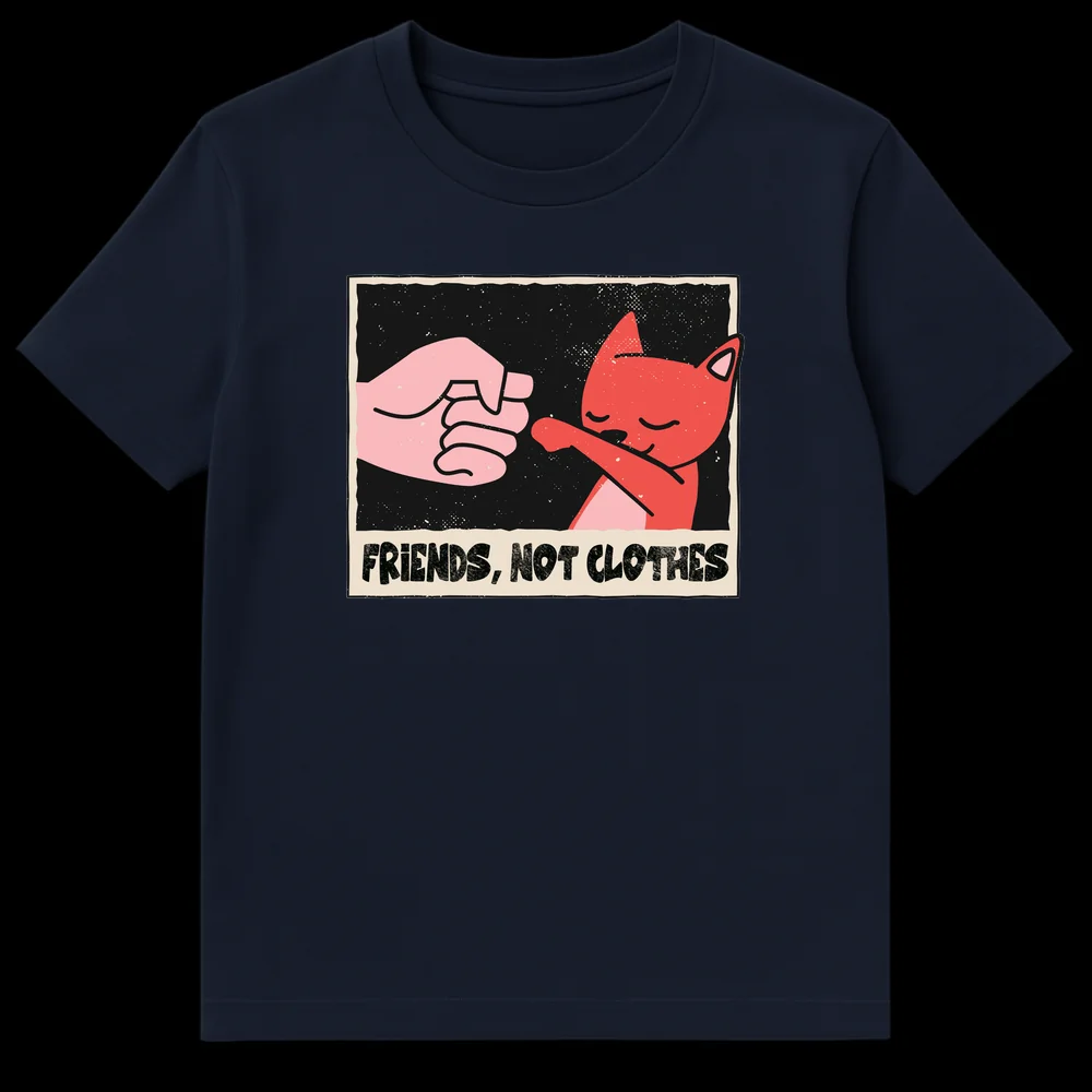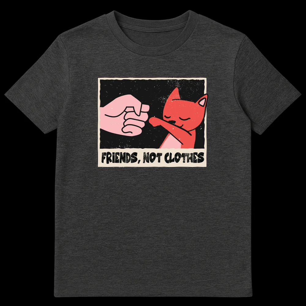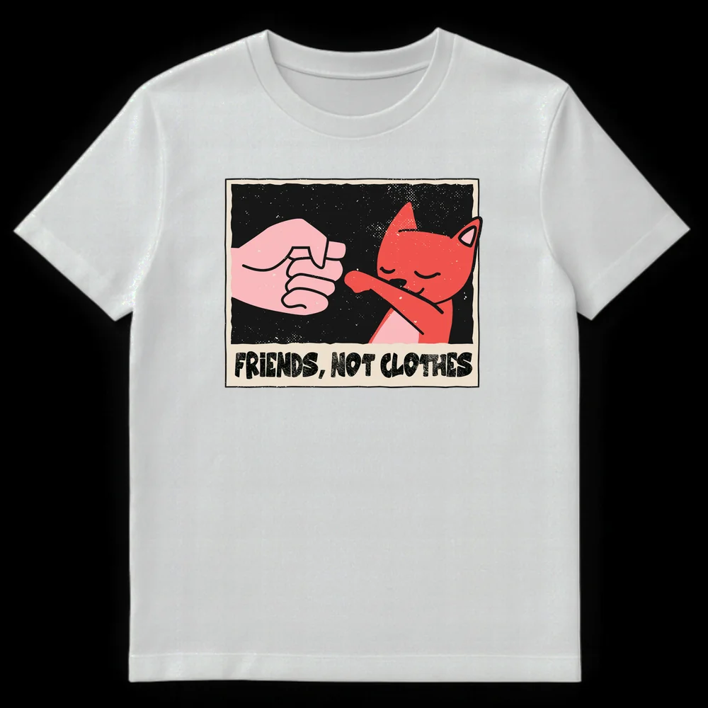 Celebrate the special bond with your furry friend with our ‘FRIENDS, NOT CLOTHES’ t-shirt. This design features a heartwarming fist bump between a human hand and a cat paw, playfully punning on the phrase ‘friends, not foes’. It’s a charming and witty way to show that your pet is family, not just an accessory. Perfect as a thoughtful gift for any devoted cat owner or pet enthusiast.