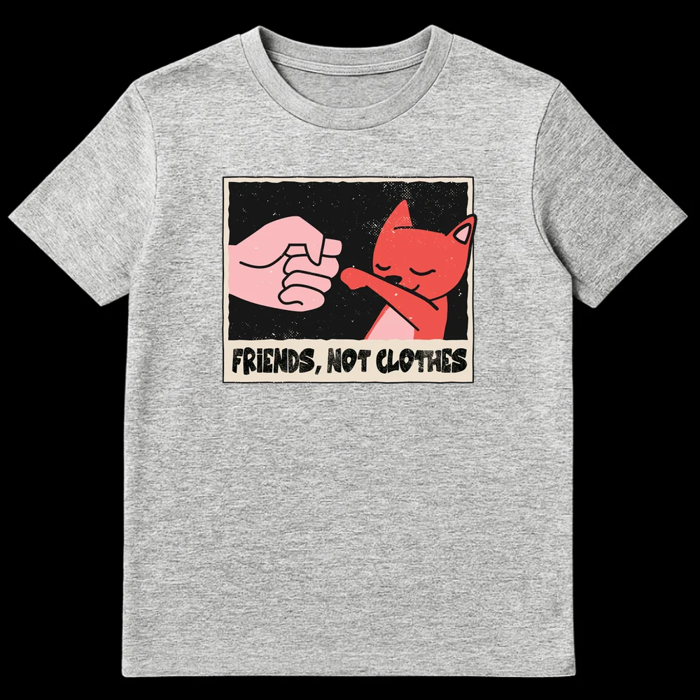 Show off your love for your feline companion with our unique ‘FRIENDS, NOT CLOTHES’ t-shirt. This delightful design captures the heartwarming connection between humans and their pets, illustrating a loyal cat and human sharing a friendly fist bump. The clever slogan is a humorous twist on a classic idiom, emphasizing that your cat is a cherished friend and family member, not just something to wear. The vintage-inspired illustration adds a touch of nostalgic charm, making this shirt a stylish and meaningful statement piece. It’s the ideal apparel for cat parents who cherish their furry family members. This comfortable tee makes a purr-fect gift for cat lovers, pet enthusiasts, or anyone who believes in the deep bond shared with animals.