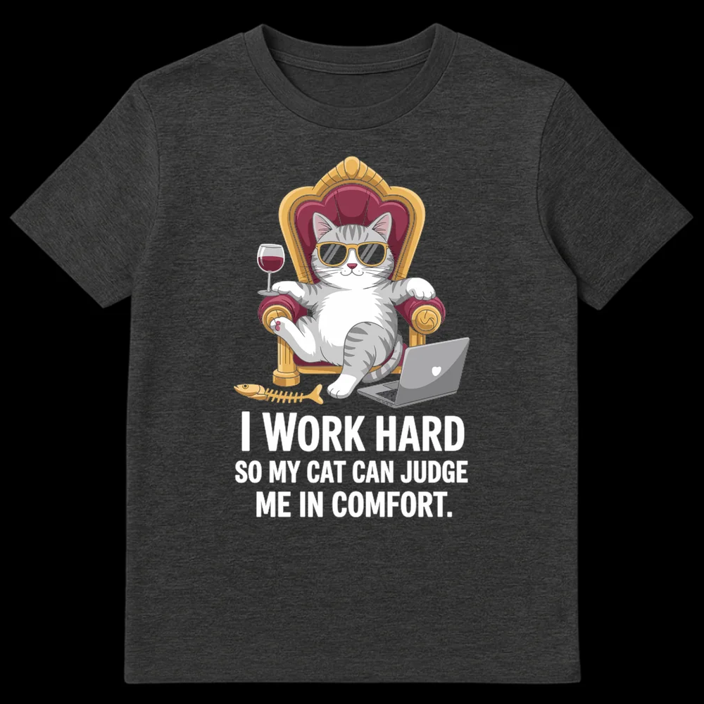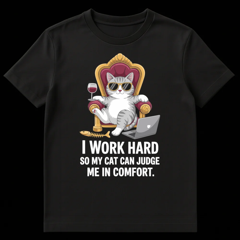 Embrace the hilarious reality of cat ownership with our “I Work Hard So My Cat Can Judge Me in Comfort” t-shirt. This design features a regal, sunglasses-wearing cat lounging on a golden throne with wine and a laptop, perfectly embodying the pampered feline overlord. It’s a relatable and witty statement for any cat mom, cat dad, or animal lover who knows the true hierarchy of their home. Perfect gift for those with a great sense of humor and an adoring bond with their furry judges.