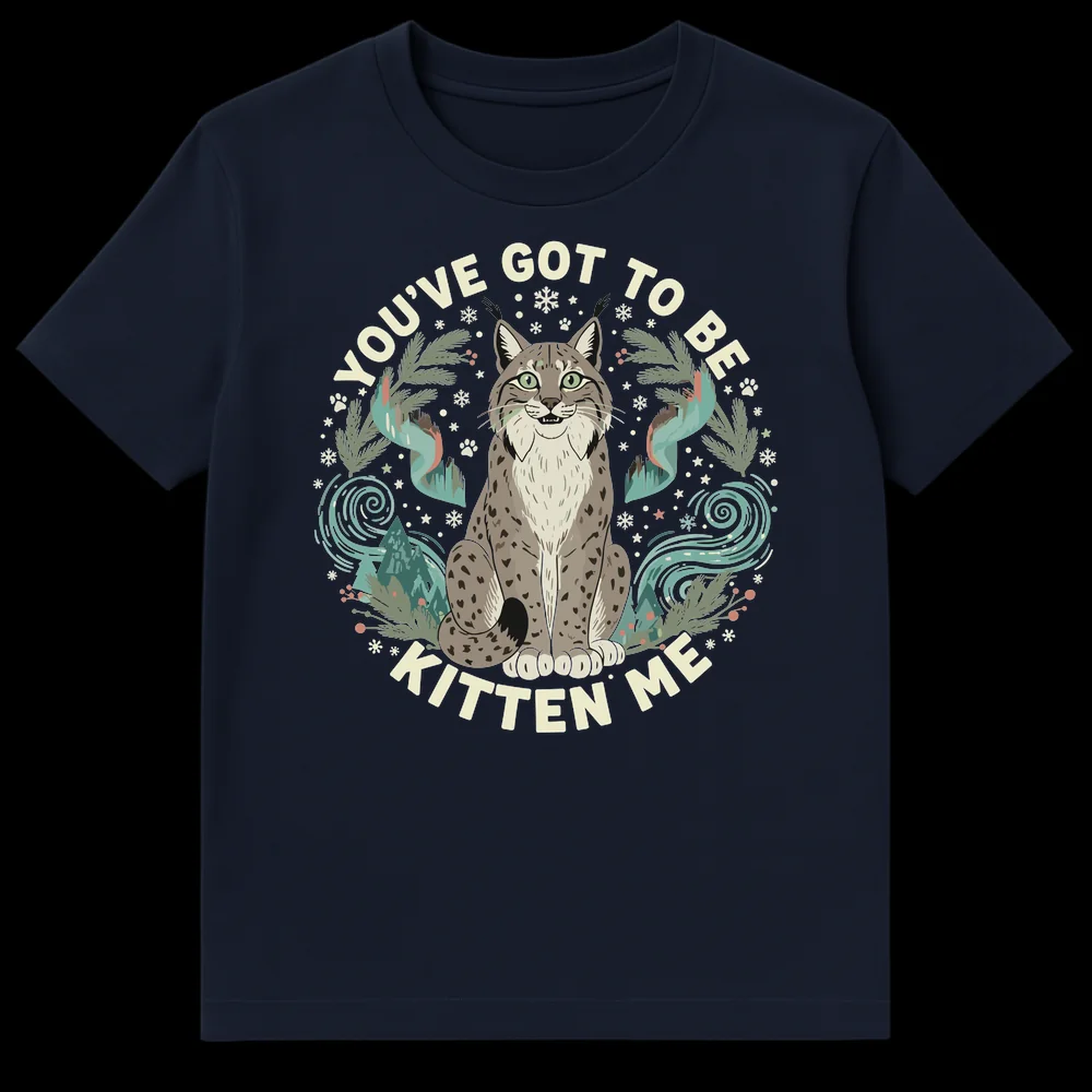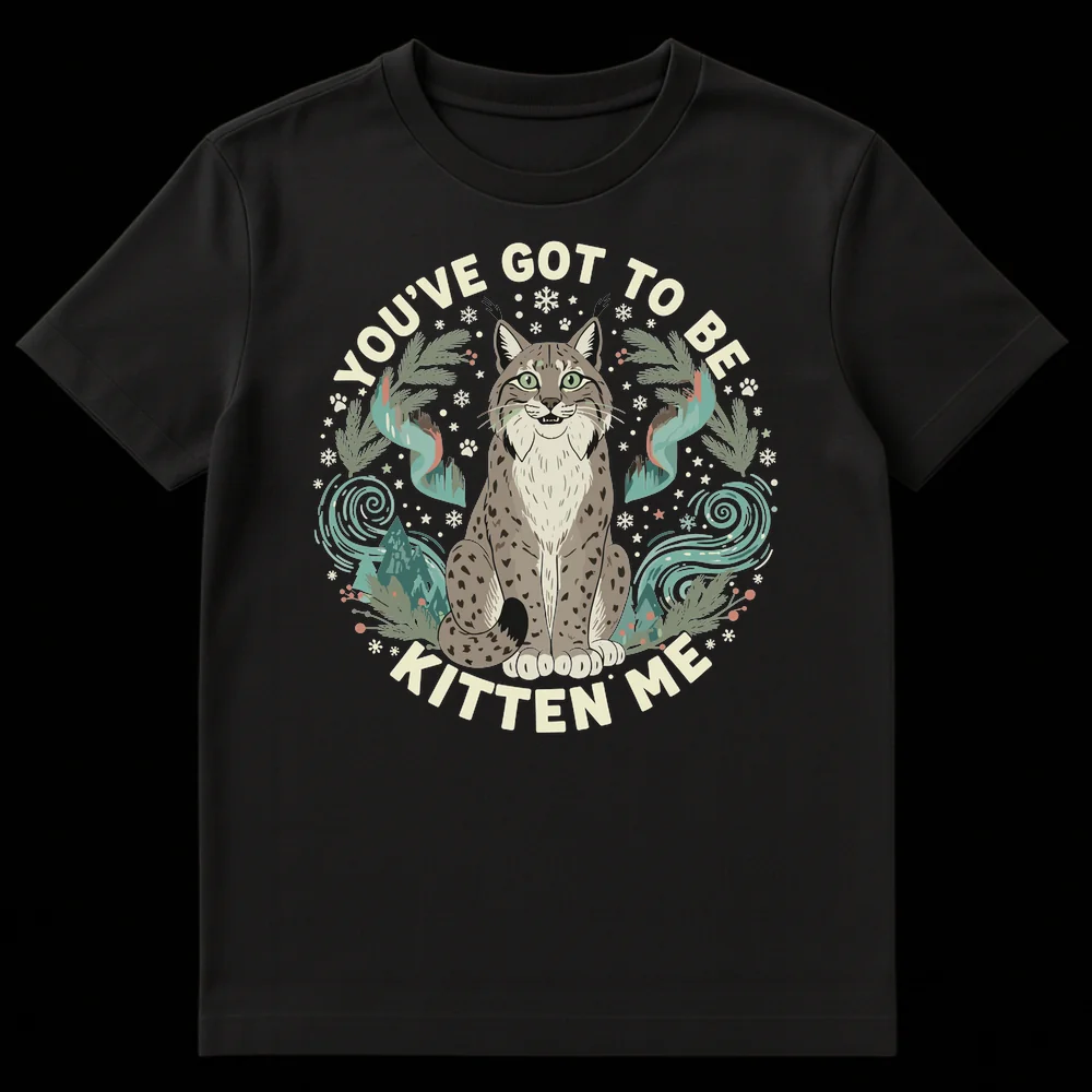 Unleash your playful side with our “You’ve Got To Be Kitten Me” t-shirt, a must-have for anyone who adores cats, lynxes, and a good pun! This design showcases a charming, stylized lynx with bright green eyes and a cheeky grin, perfectly embodying the humorous twist on the classic phrase. Surrounded by a beautiful winter forest motif, including pine branches, berries, and snowflakes, the tee combines nature’s beauty with irresistible feline wit. Made for comfort and style, it’s an excellent conversation starter and a fantastic gift for cat lovers, wildlife enthusiasts, or anyone with a quirky sense of humor who enjoys animal-themed apparel.