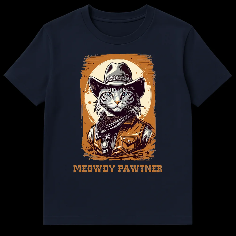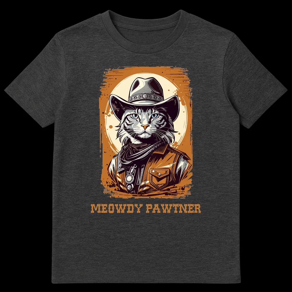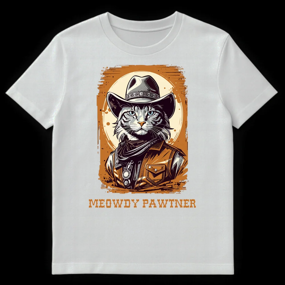 Saddle up for some purr-fectly delightful humor with our “Meowdy Pawtner” t-shirt! This unique design masterfully combines the charm of domestic cats with the rugged appeal of the Old West. The central graphic showcases a detailed, illustrative grey tabby cat, sporting a classic cowboy hat, bandana, and vest, set against a distressed Western-themed backdrop. The clever wordplay “MEOWDY PAWTNER” is a hilarious mashup of cat sounds and classic cowboy greetings, guaranteed to bring smiles and start conversations. It’s an ideal choice for anyone who adores cats, has a soft spot for Western culture, or simply loves wearing unique apparel that expresses their playful personality. This t-shirt makes an excellent gift for birthdays, holidays, or just because, appealing to a broad demographic of cat lovers and pun enthusiasts alike.