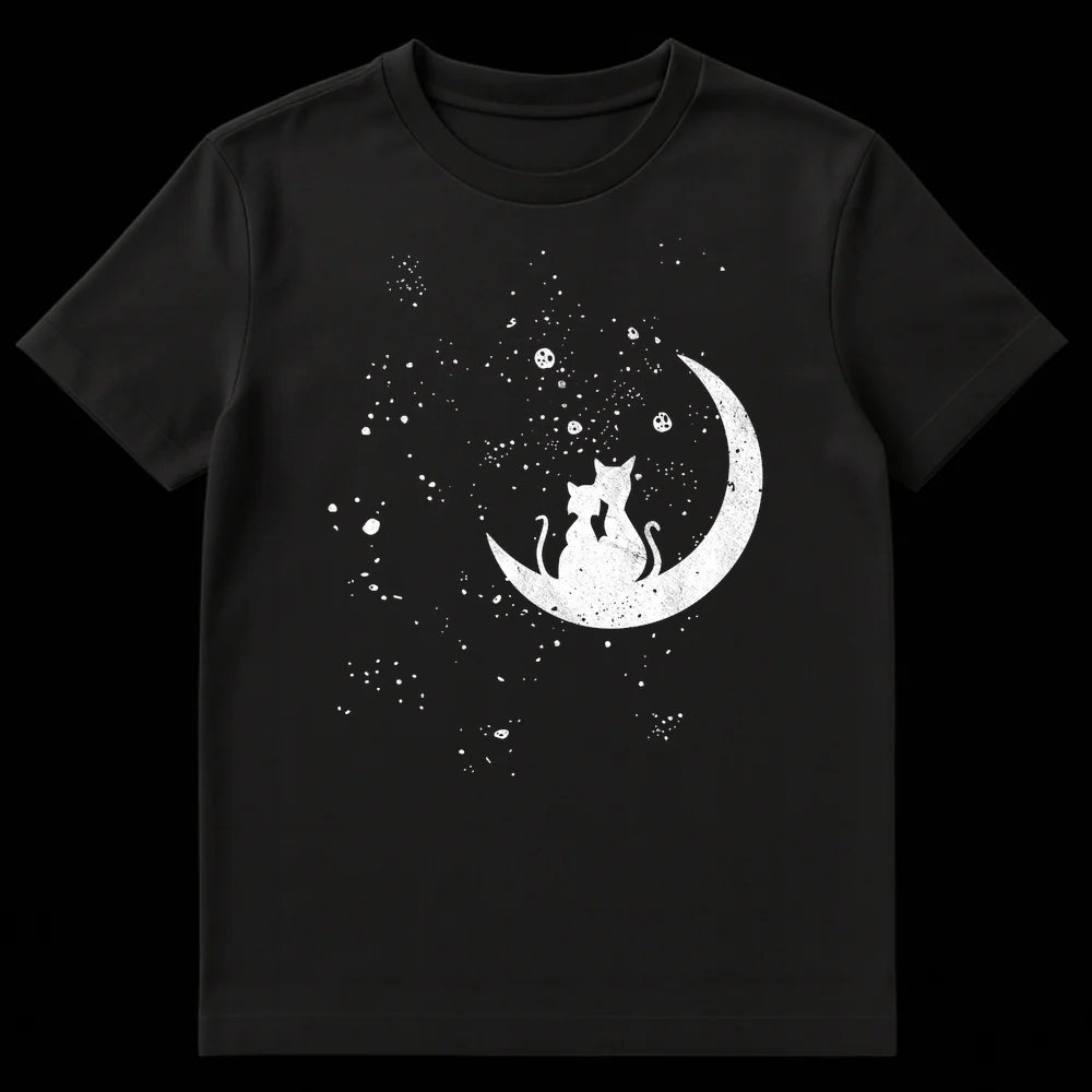 Embrace the magic of the night sky with this enchanting design featuring two affectionate cats perched together on a crescent moon, surrounded by a twinkling celestial scene. This unique silhouette art piece, with its distressed texture, evokes feelings of warmth, companionship, and dreamlike wonder. It’s an ideal gift for cat lovers, romantics, or anyone who adores whimsical celestial themes.