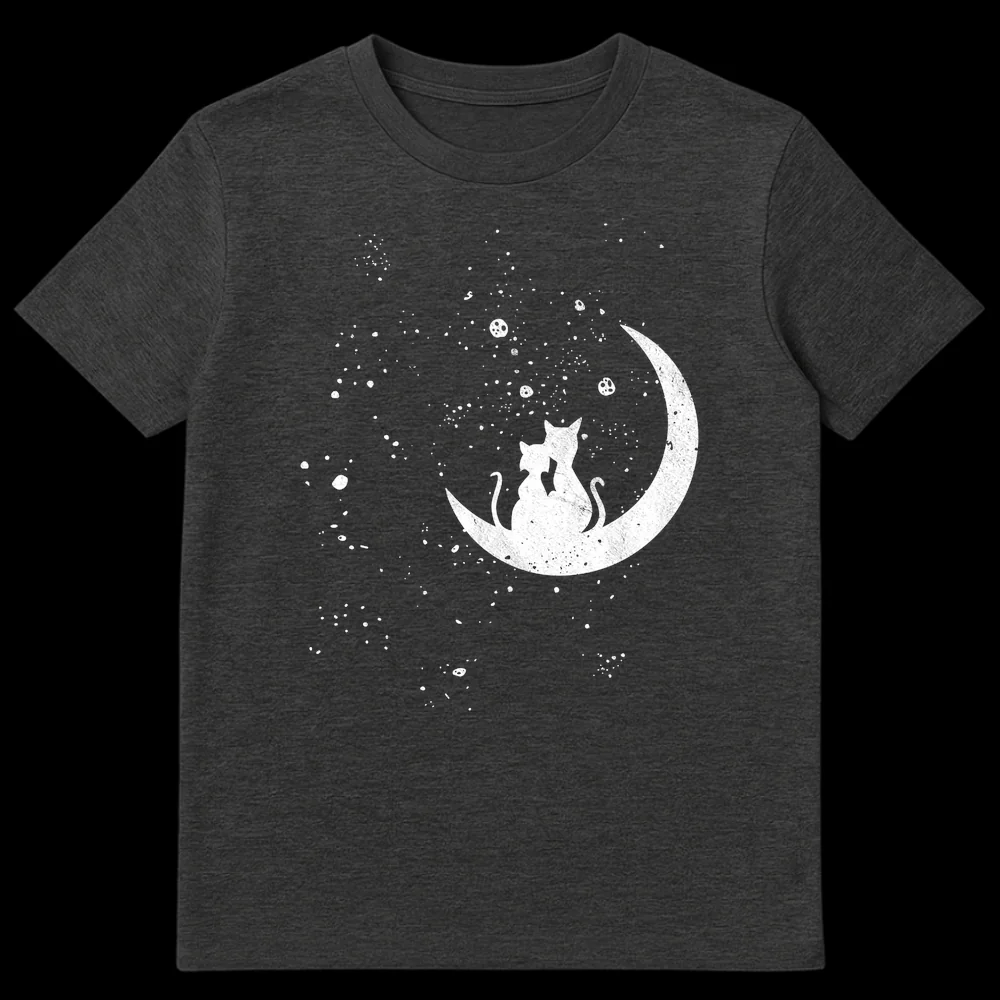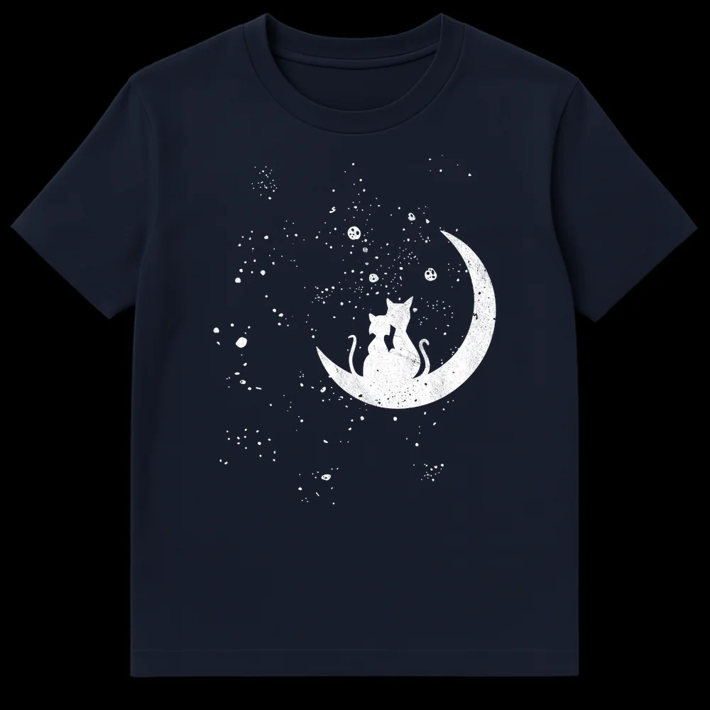 Discover true enchantment with our ‘Romantic Moon Cats Starry Night’ T-shirt, a captivating blend of silhouette art and celestial charm. This design beautifully portrays two feline companions, nestled lovingly on a crescent moon, gazing out at a serene, star-filled night sky. The distressed texture adds a unique, worn-in aesthetic, making the white cats and moon glow softly against the dark background. It’s more than just a shirt; it’s a wearable piece of art that symbolizes love, peace, and the whimsical connection to the universe. Perfect for cat lovers, couples, or anyone who finds solace and magic in the moon and stars. Give the gift of dreams and affection with this truly special design.