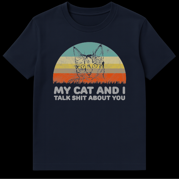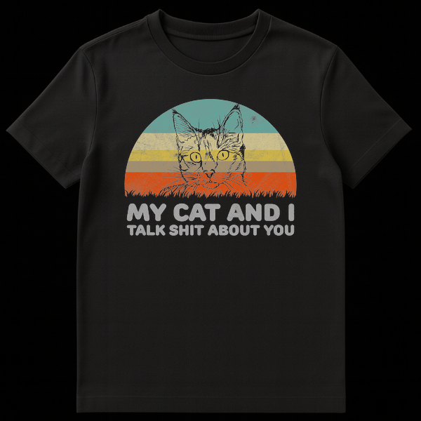 Embrace your inner cat connoisseur with this uniquely humorous tee. Featuring a retro-styled, wide-eyed cat peeking over a distressed sunset backdrop, it boldly declares, “MY CAT AND I TALK SHIT ABOUT YOU.” This design perfectly captures the playful, slightly sassy bond between a cat and its owner, making it an ideal gift for cat moms, cat dads, or anyone who appreciates a good laugh with a touch of feline attitude.