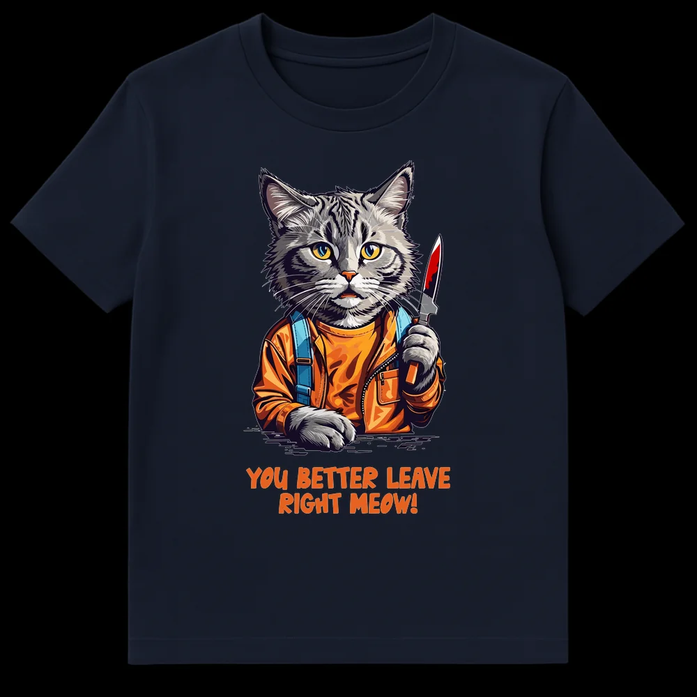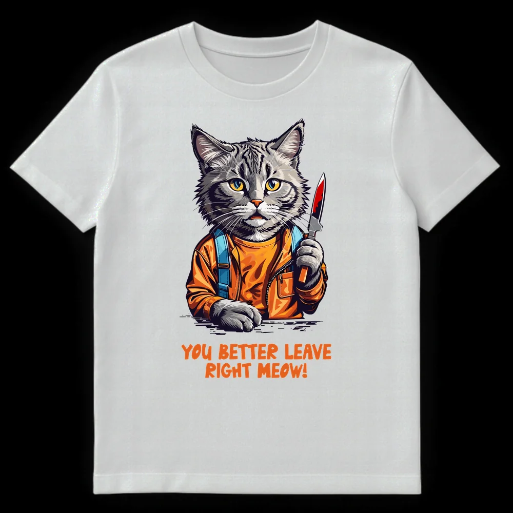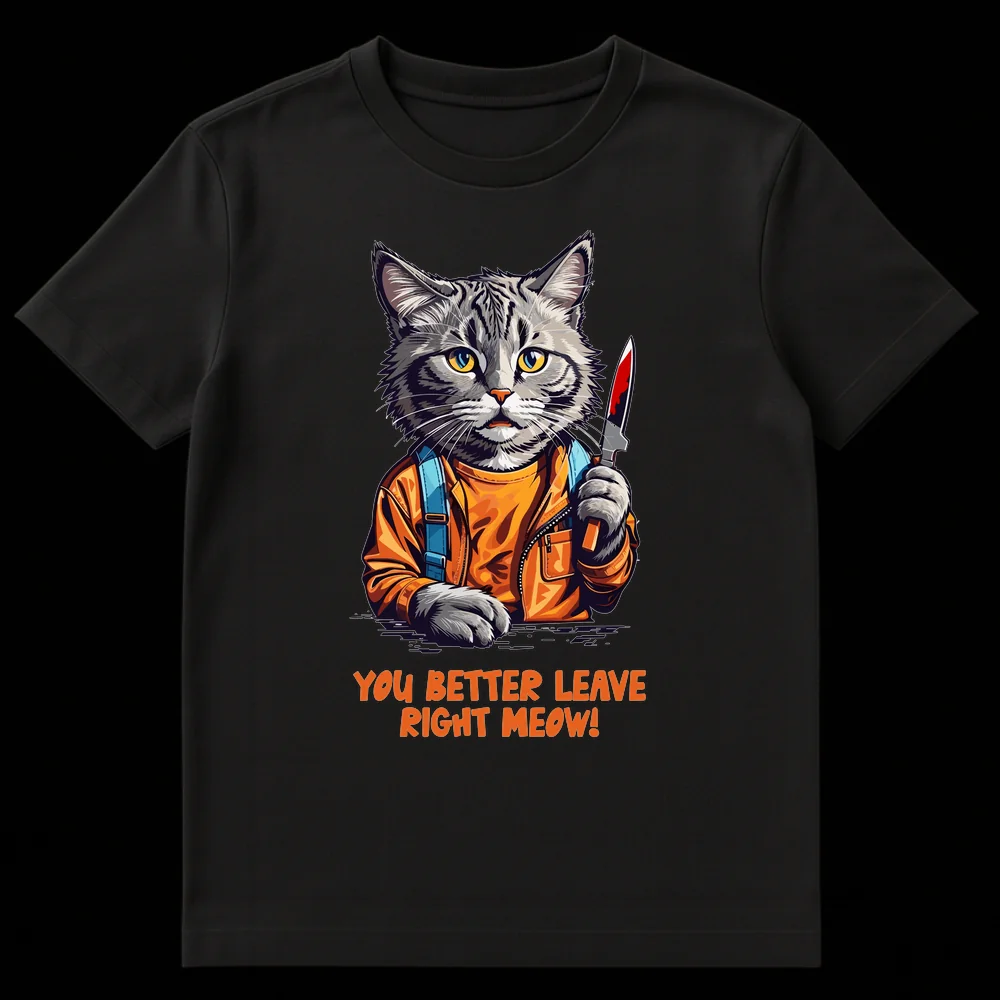 Unleash your inner feline sass with our ‘YOU BETTER LEAVE RIGHT MEOW!’ t-shirt. This design features a stern anthropomorphic cat, complete with a bloodied knife and a hilarious pun that twists a classic threat. It’s a purr-fect blend of cute and edgy humor, ideal for cat lovers who appreciate witty wordplay and a touch of dark fun. Makes an amazing novelty gift for anyone with a playful, sarcastic side.