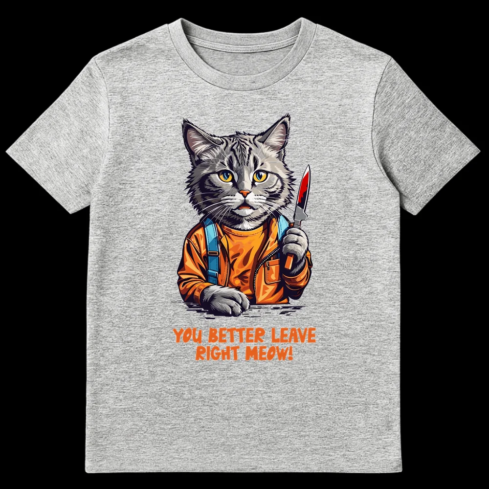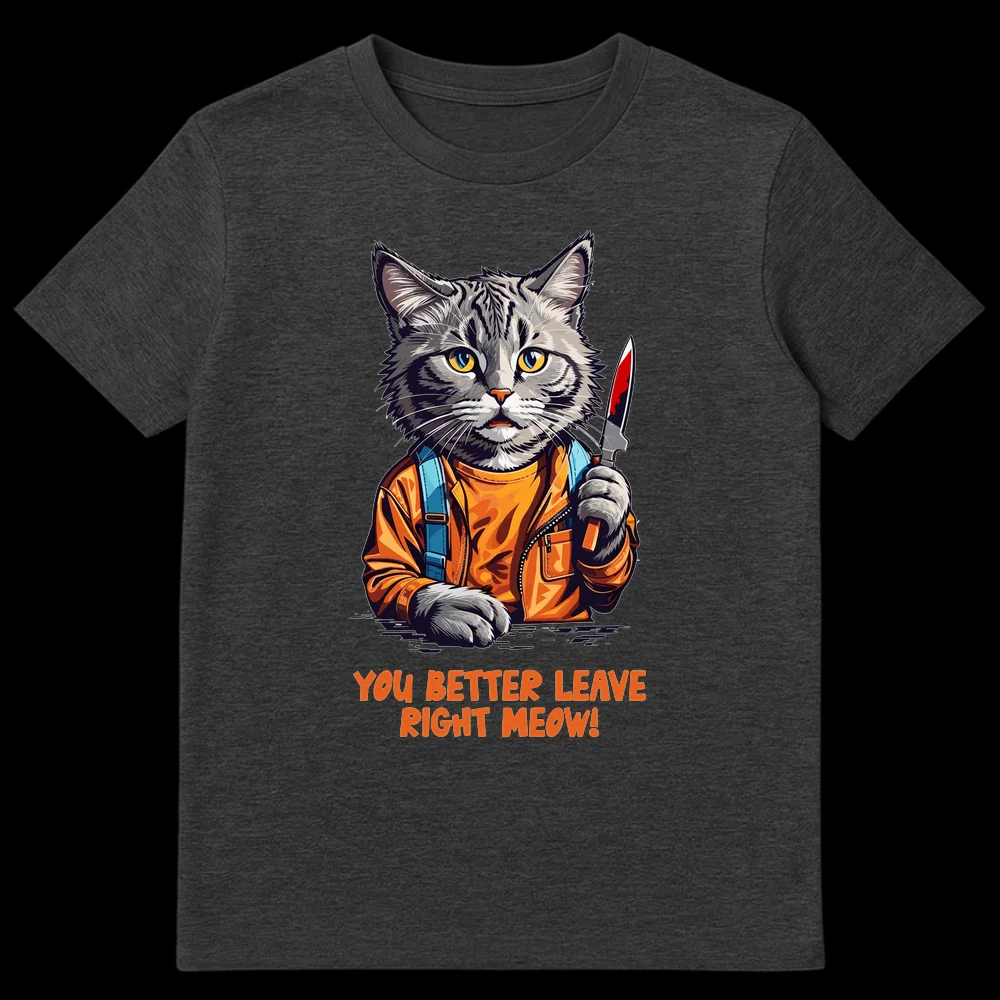 Make a bold statement with our ‘YOU BETTER LEAVE RIGHT MEOW!’ t-shirt, a unique design guaranteed to turn heads and spark conversations. This graphic tee brilliantly combines the charm of a gray tabby cat with a humorous, yet menacing, twist—our feline friend sports an orange jacket and blue overalls while wielding a bloodied knife, delivering a classic cat pun. The phrase ‘YOU BETTER LEAVE RIGHT MEOW!’ playfully replaces ‘now’ with a cat’s signature sound, creating an irresistibly funny and slightly edgy threat. It’s a fantastic blend of ‘kawaii’ cuteness and a hint of dark humor, perfect for those who appreciate internet culture and clever wordplay. This shirt is an excellent gift for cat enthusiasts, meme lovers, or anyone with a sarcastic sense of humor who isn’t afraid to show their playful, rebellious side. Express your unique personality and love for cats in the most amusing way possible.