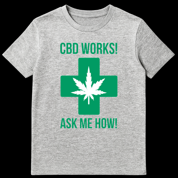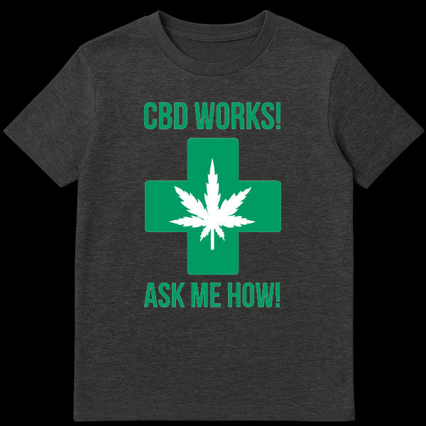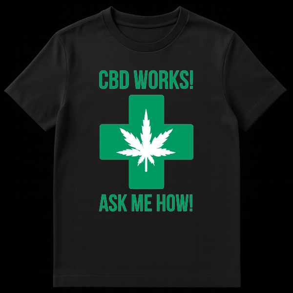 Declare your support for natural wellness with our ‘CBD WORKS! ASK ME HOW!’ t-shirt. This striking high-contrast design features a vibrant green medical cross boldly superimposed with a white cannabis leaf on a minimalist black background. It’s the perfect statement piece for anyone passionate about CBD and its potential health benefits, making it an ideal gift for advocates and enthusiasts alike.