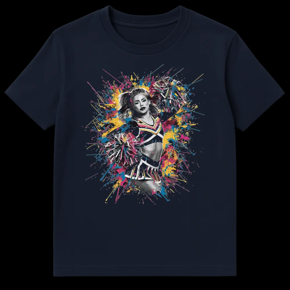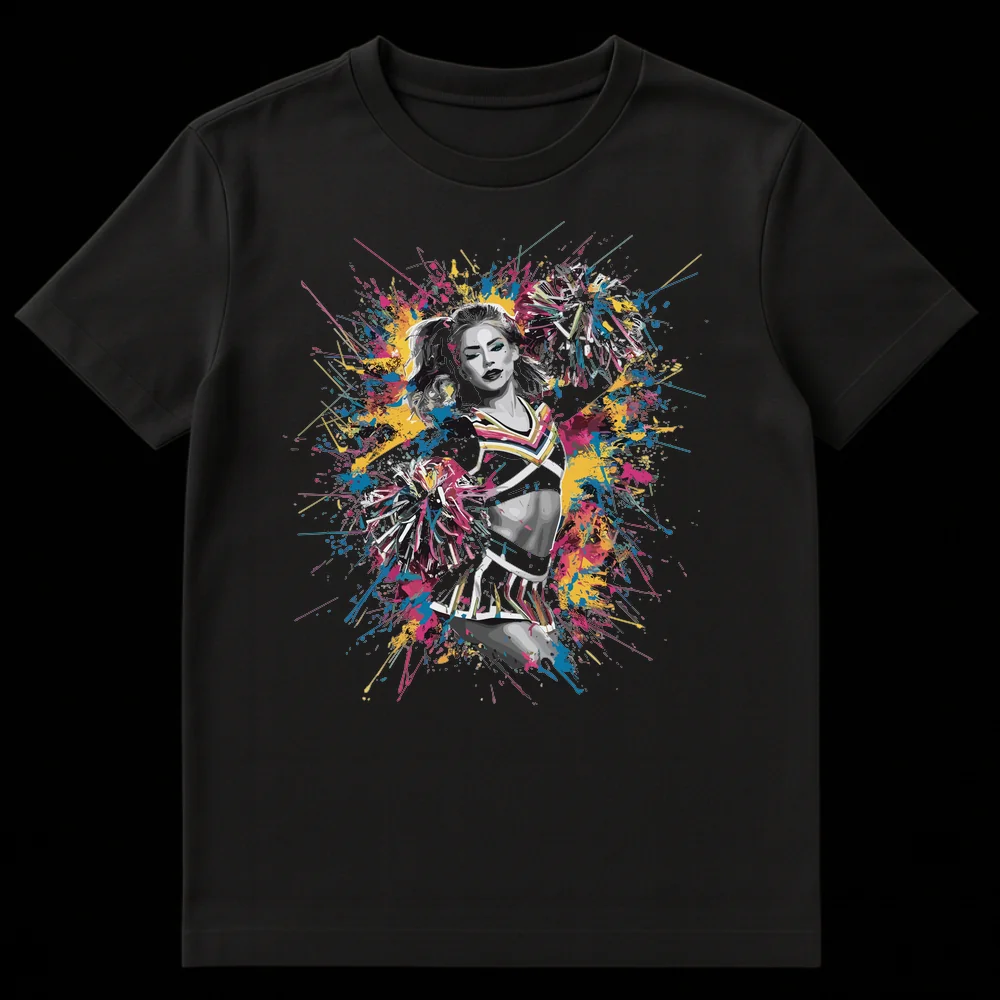 Unleash your vibrant spirit with this unique cheerleader t-shirt, blending a powerful monochrome figure with an explosion of dynamic, colorful splatter paint. This design embodies the energy and confidence of performance, making it a bold statement piece. Perfect for cheerleaders, dance enthusiasts, or anyone who loves high-energy, expressive art. A fantastic gift for those who radiate passion and style.